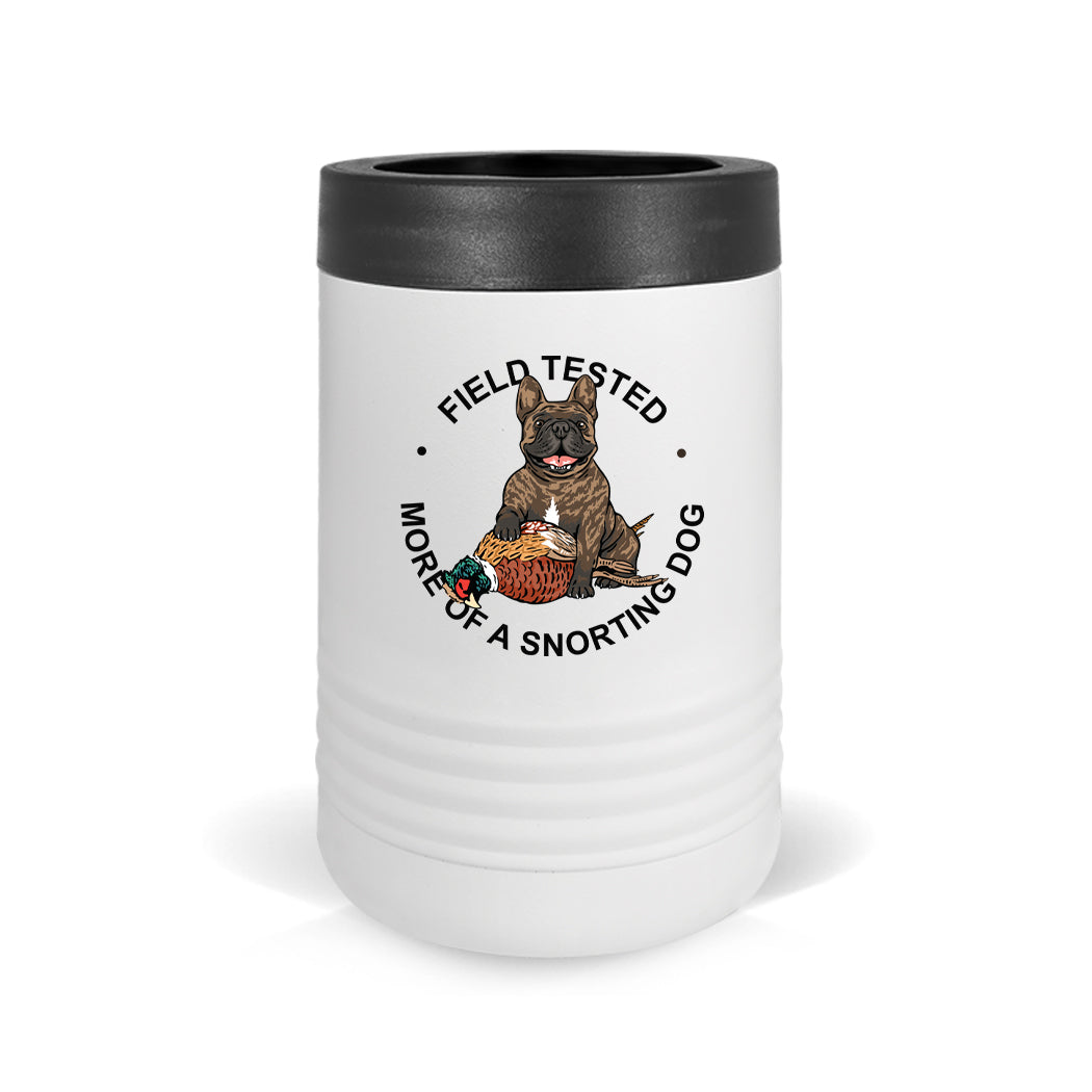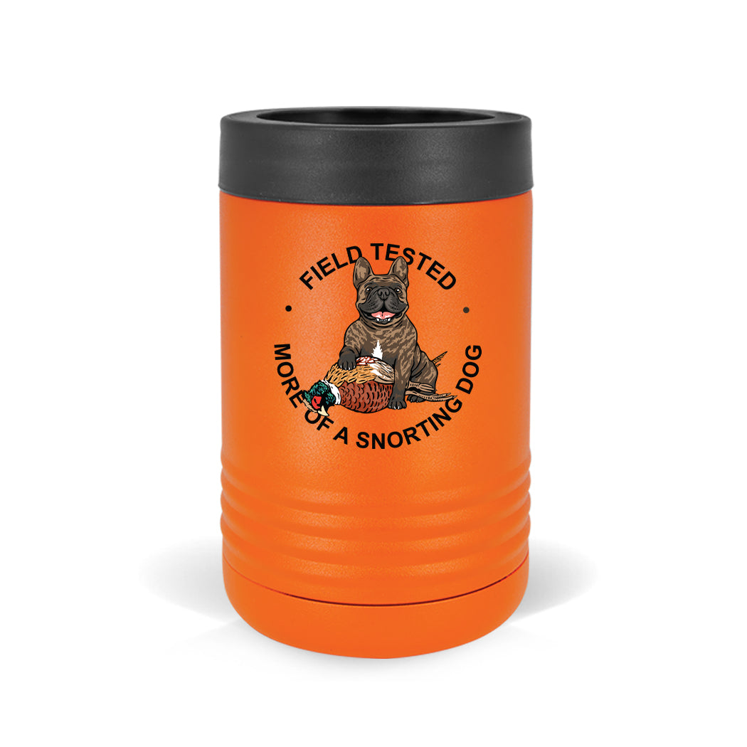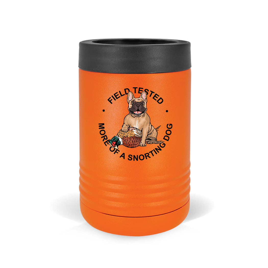 Our 12 oz Hunting French Bulldog can cooler is the perfect gift for anyone who owns this snorting little sidekick (whether they aspire to be a bird dog or not). Keeps drinks refreshingly cold on hot days while you brag about your weird little dog, whether or not they aspire to be a bird dog. Simply screw off the rubber top and place your favorite beverage inside the double walled, insulated stainless steel cooler. It's time to take your koozie to the next level!