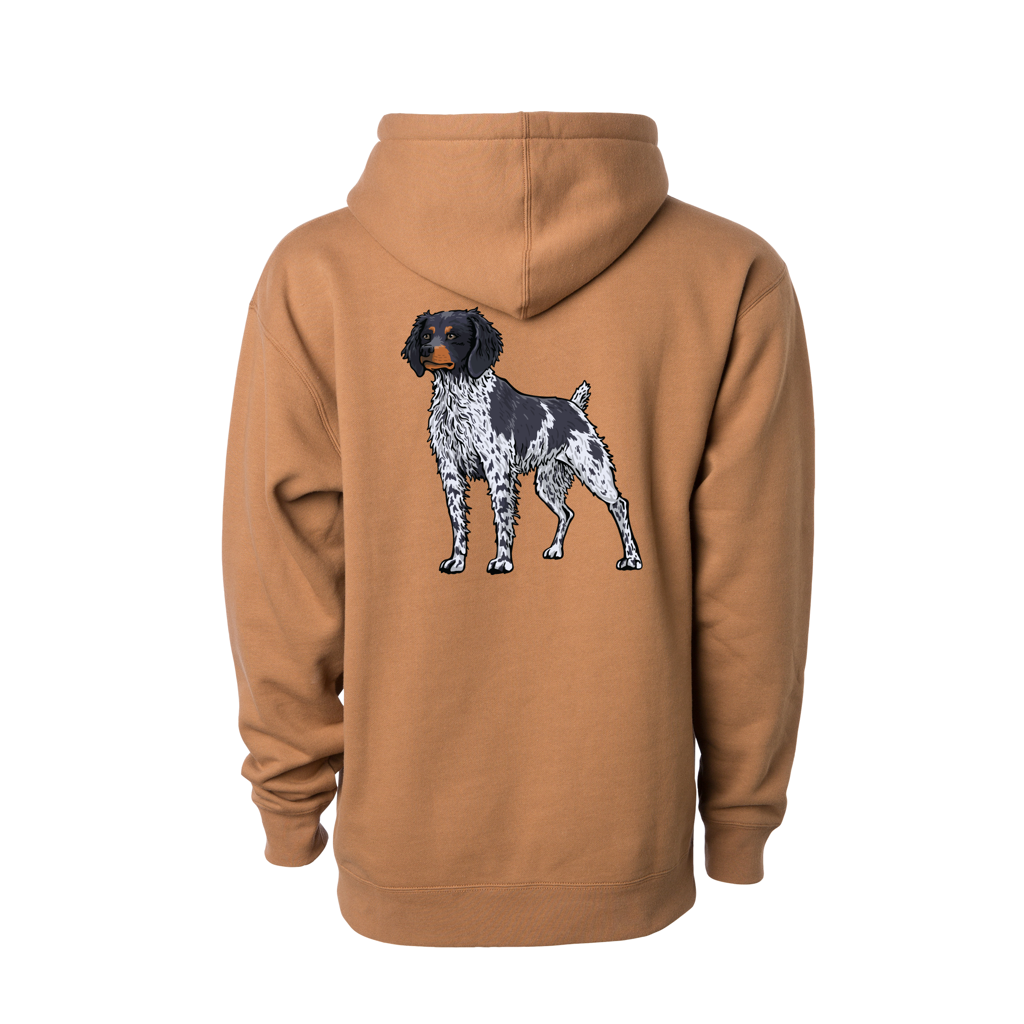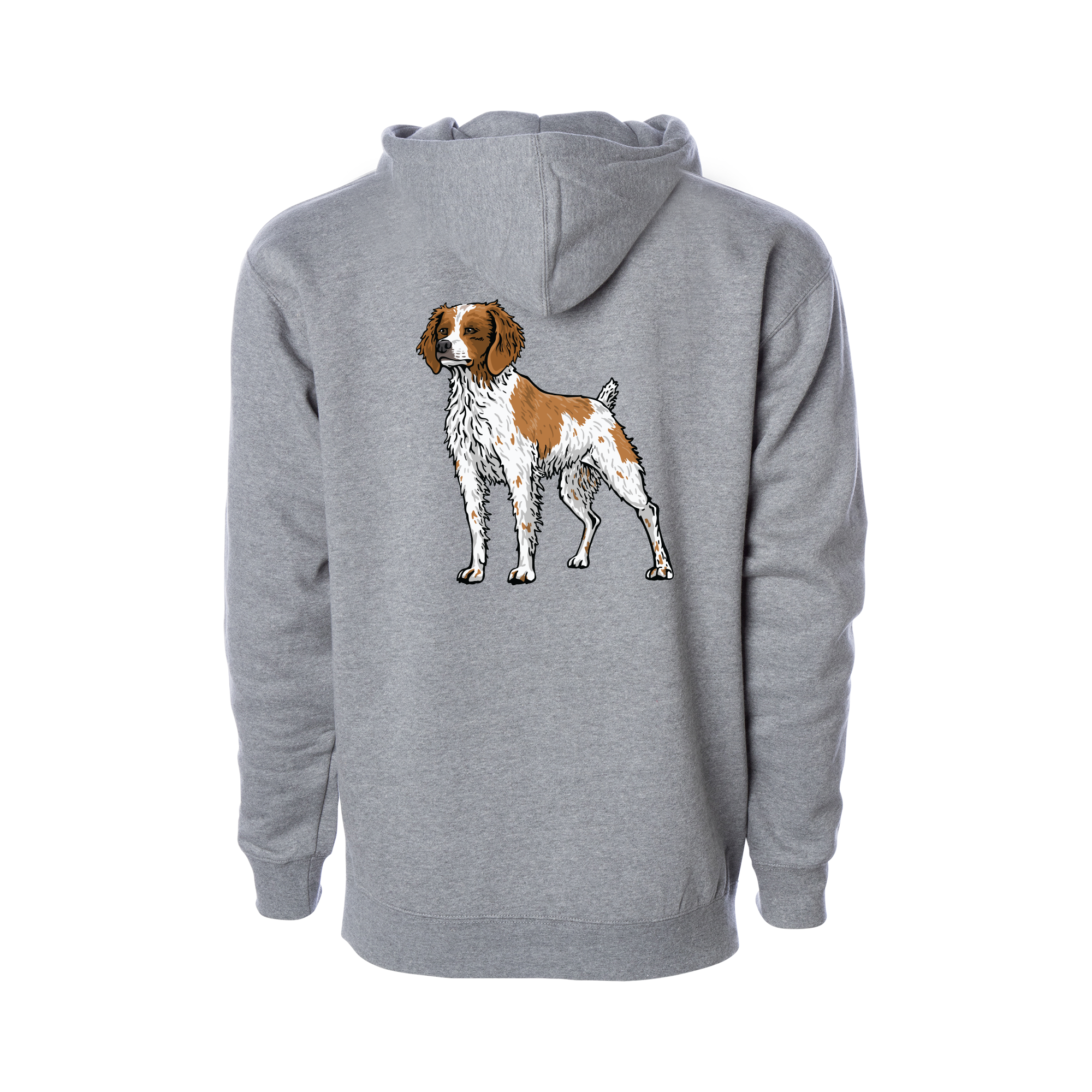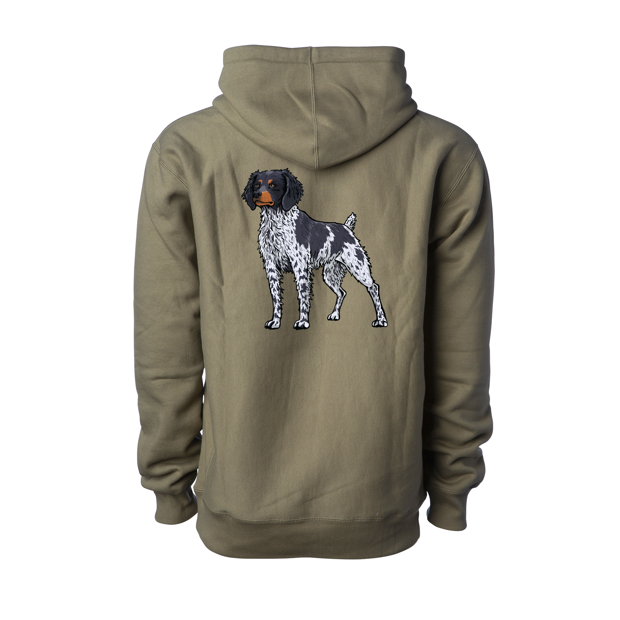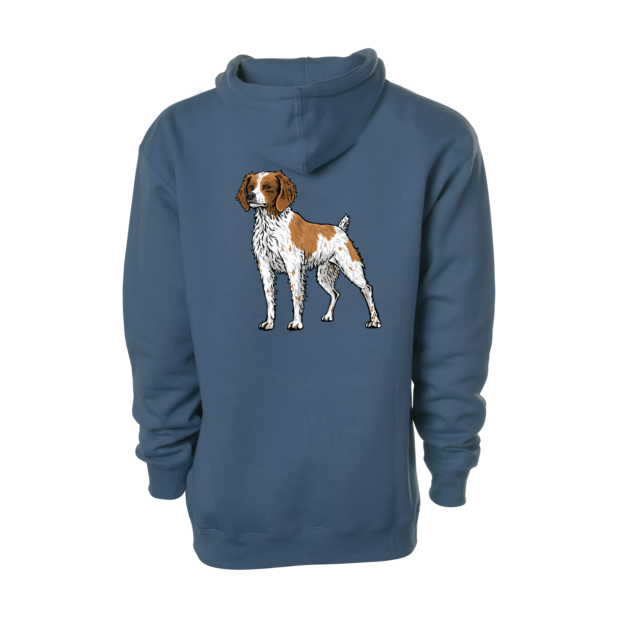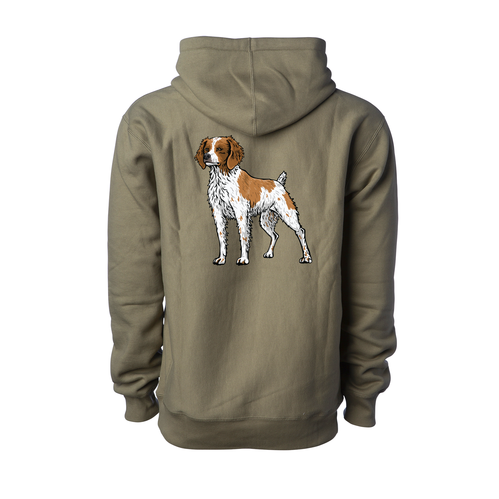 This French Brittany pullover hoodie is bound to be an instant classic for cold weather. If you're into Epagneul Bretons, you'll love repping this hooded sweatshirt. The heavyweight brushed fleece will keep you warm in the field or at home, plus it’s soft and super comfortable. Made from a 10 oz. cotton and polyester blend with a generous fit. Available in Olive, Saddle, Blaze Orange, Heather Grey and Storm Blue. The OLIVE color is a 13.5oz Super Heavyweight Premium cross-grain hooded pullover and the best French Brittany hoodie ever made.