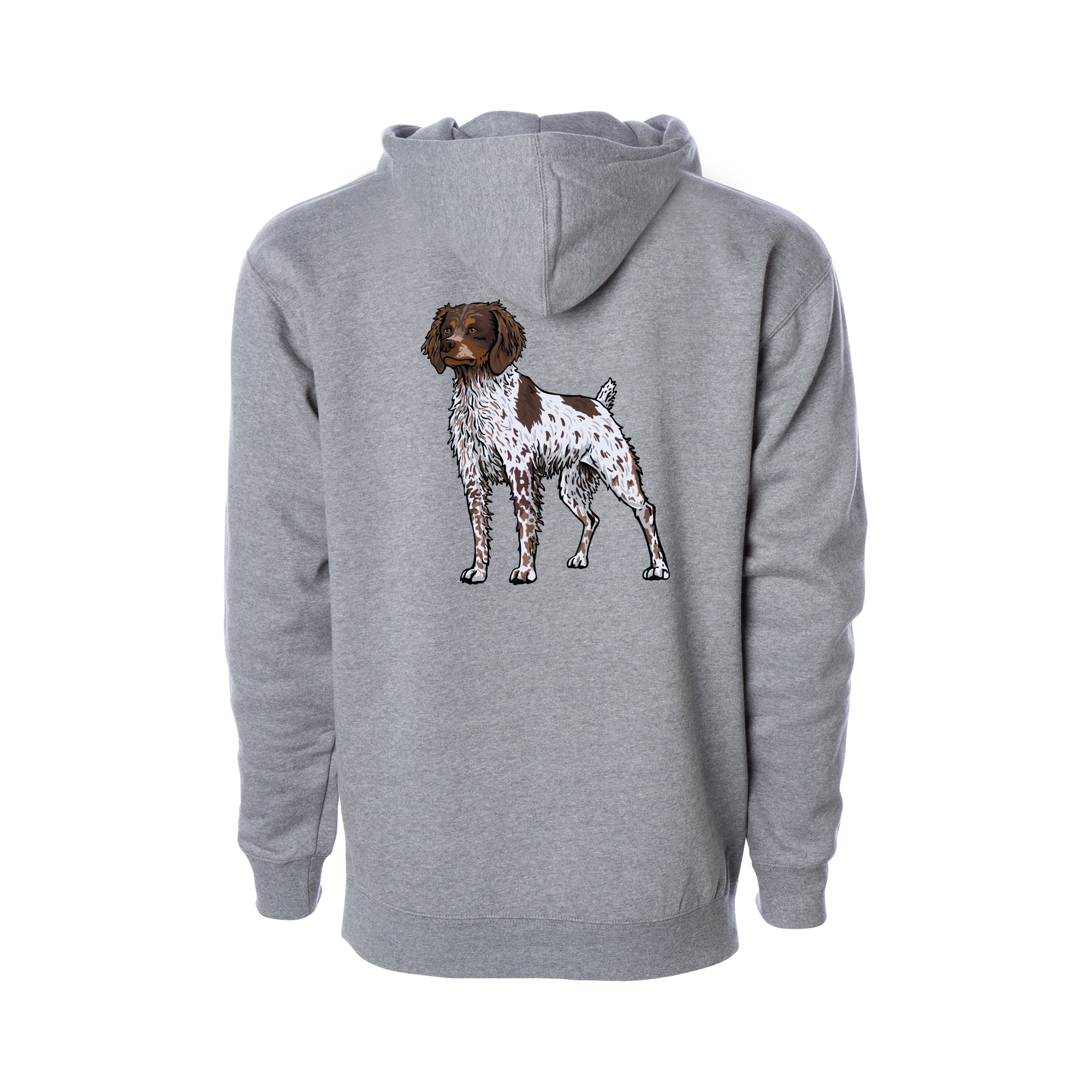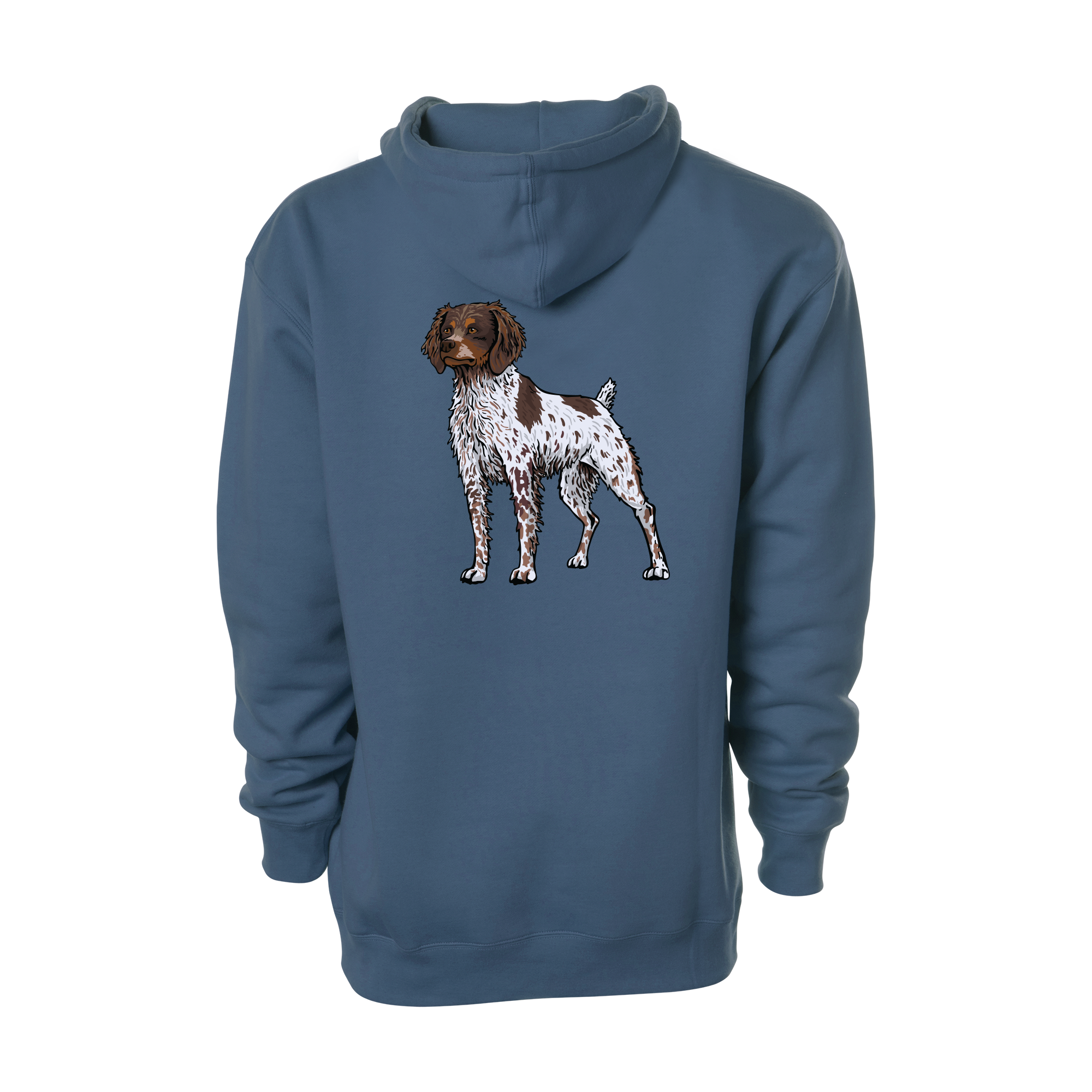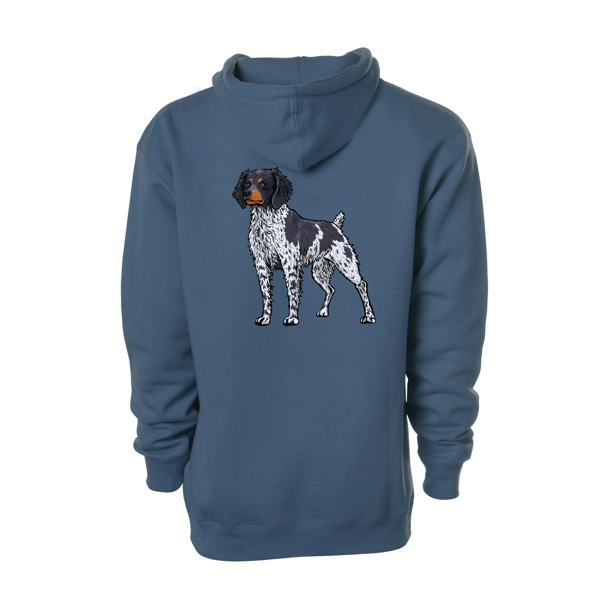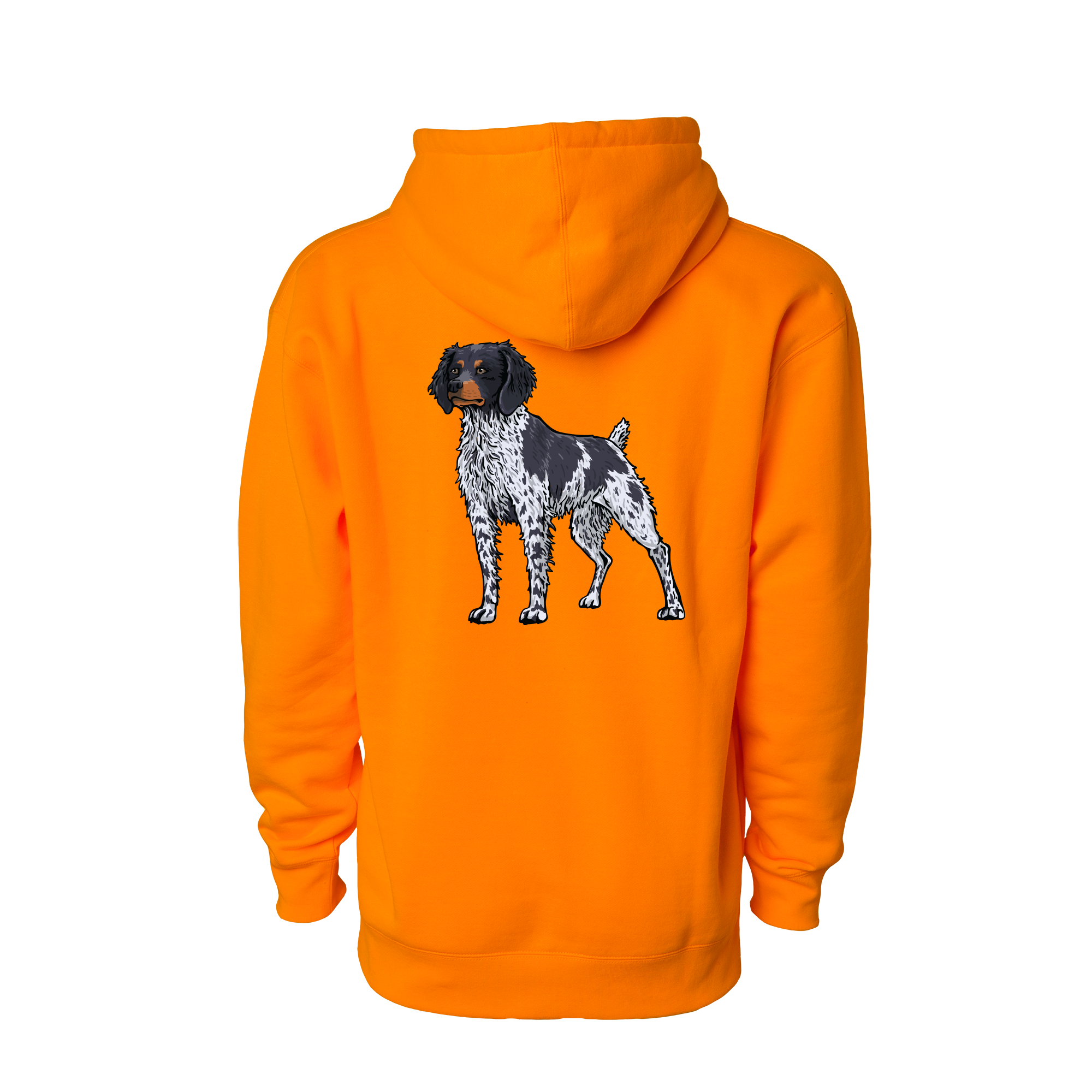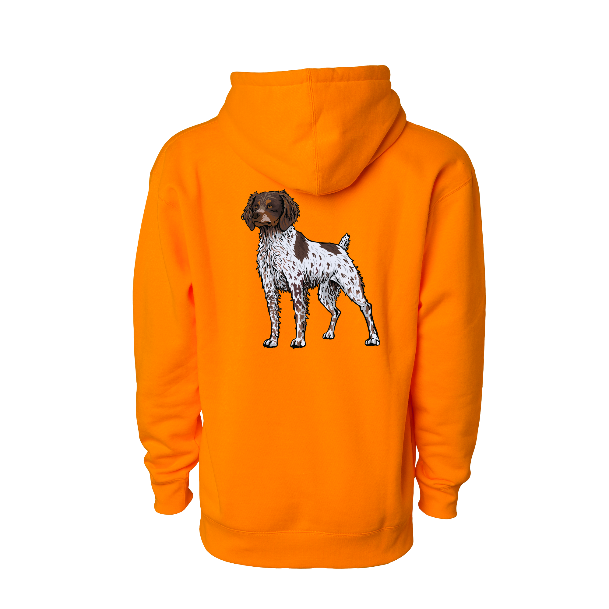 This French Brittany pullover hoodie is bound to be an instant classic for cold weather. If you're into Epagneul Bretons, you'll love repping this hooded sweatshirt. The heavyweight brushed fleece will keep you warm in the field or at home, plus it’s soft and super comfortable. Made from a 10 oz. cotton and polyester blend with a generous fit. Available in Olive, Saddle, Blaze Orange, Heather Grey and Storm Blue. The OLIVE color is a 13.5oz Super Heavyweight Premium cross-grain hooded pullover and the best French Brittany hoodie ever made.
