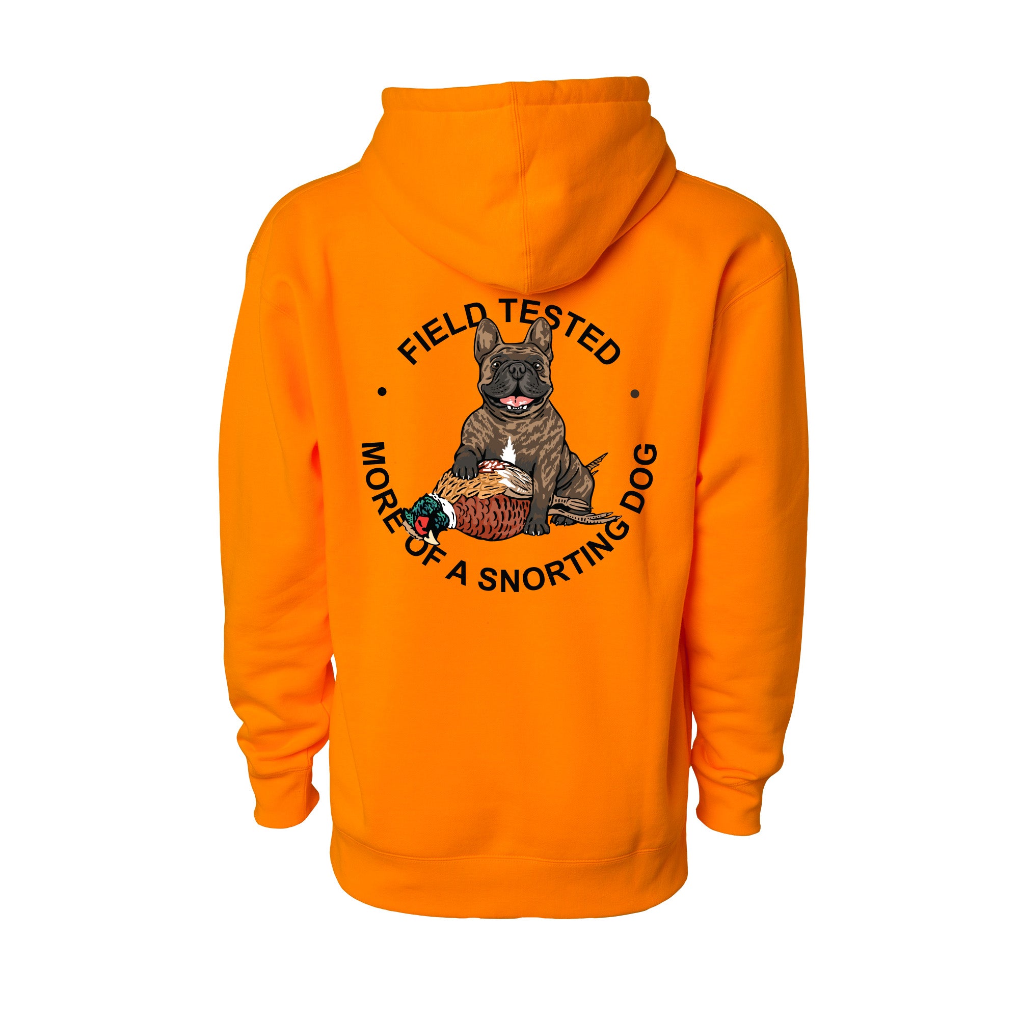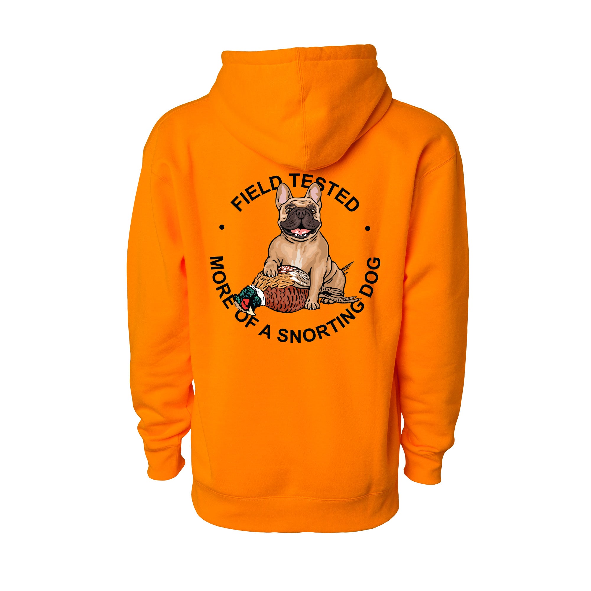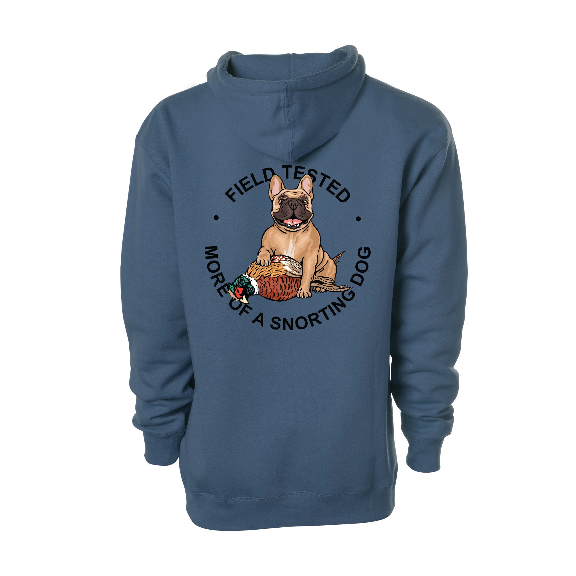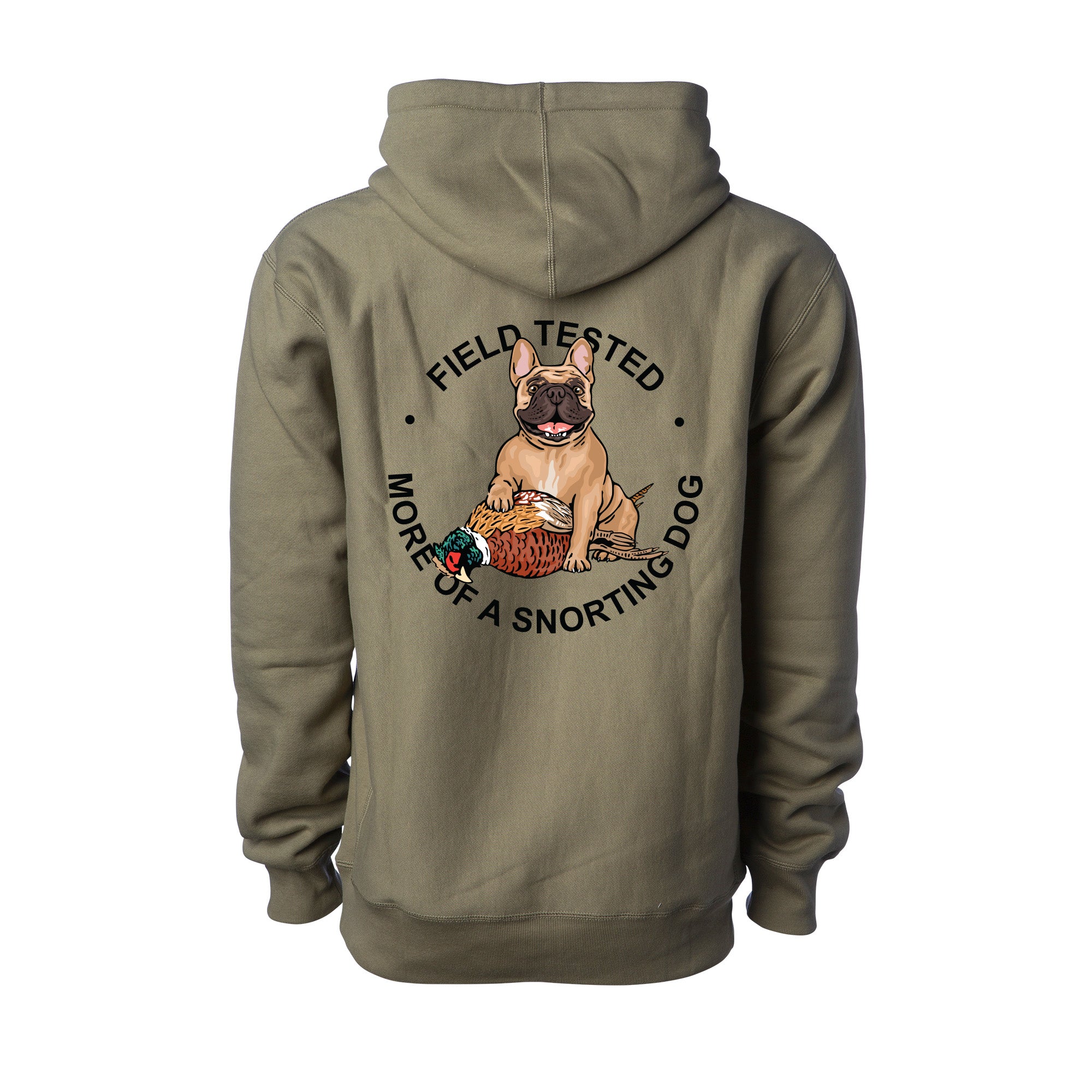 This Hunting French Bulldog pullover hoodie is bound to provide instant comedy for anyone who owns this snorting little sidekick–whether they aspire to be a bird dog or not. The heavyweight brushed fleece sweatshirt will keep you warm in the field or at home, plus it’s soft and super comfortable. Made from a 10 oz. cotton and polyester blend with a generous fit. Available in Olive, Blaze Orange, Saddle and Storm Blue. The OLIVE color is a 13.5oz Super Heavyweight Premium cross-grain hooded pullover and the best French bulldog hoodie ever made.