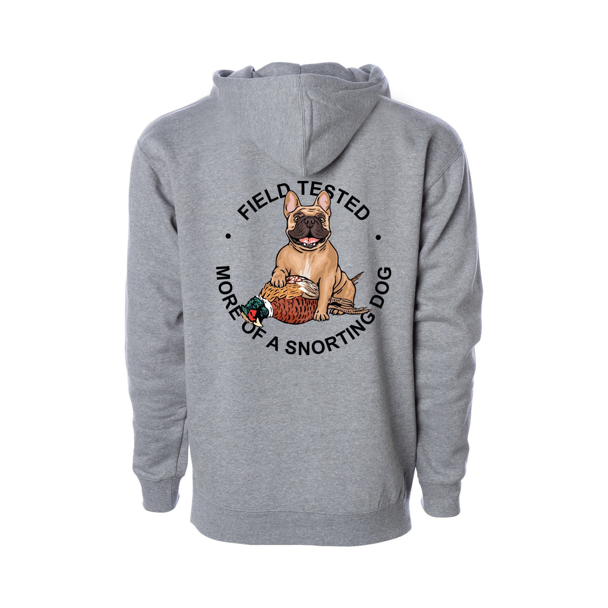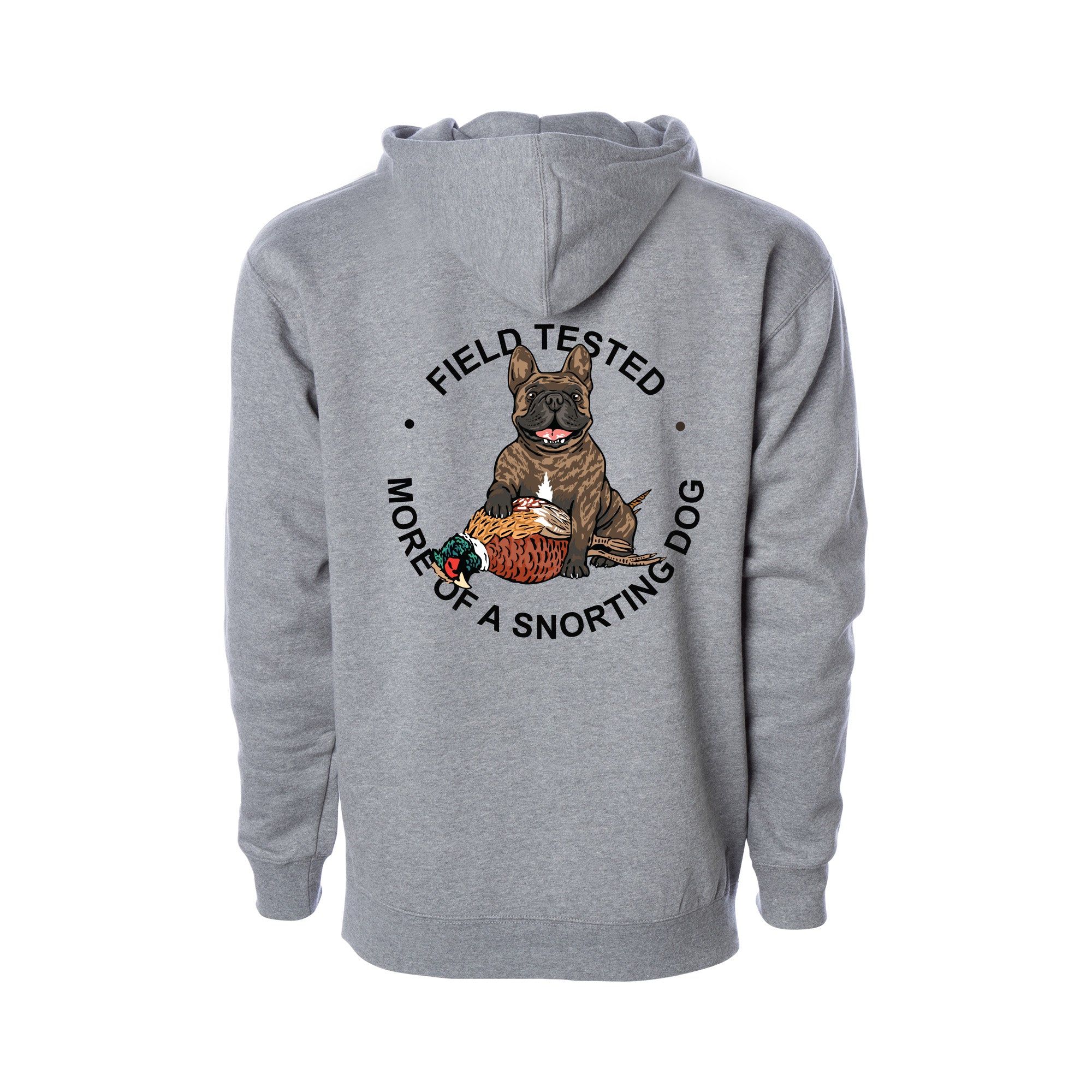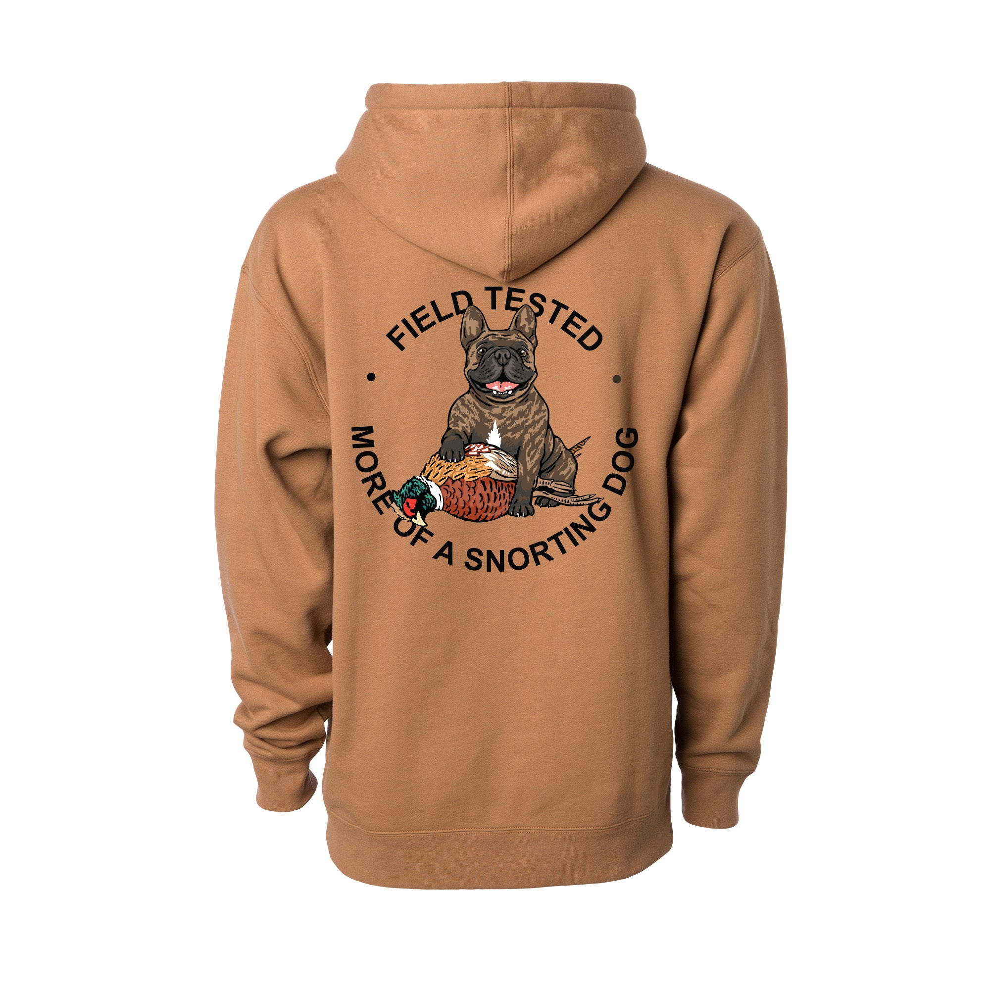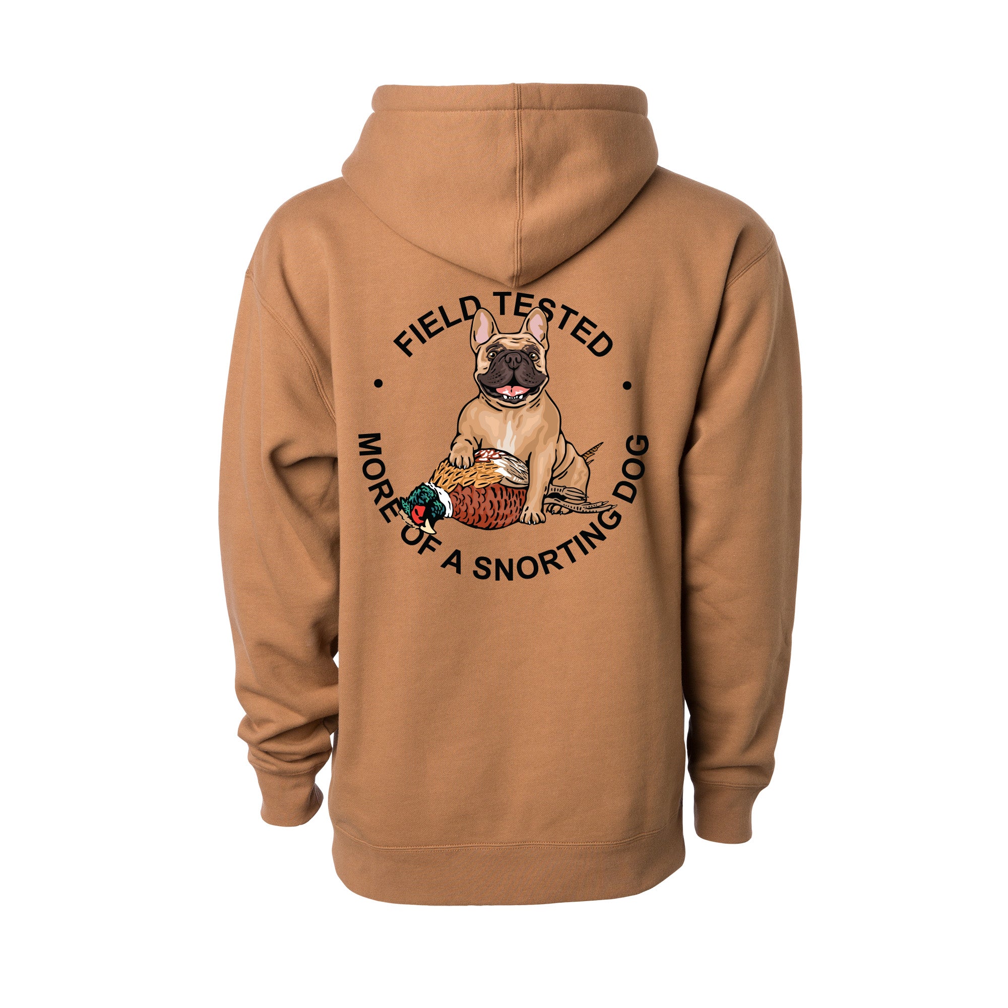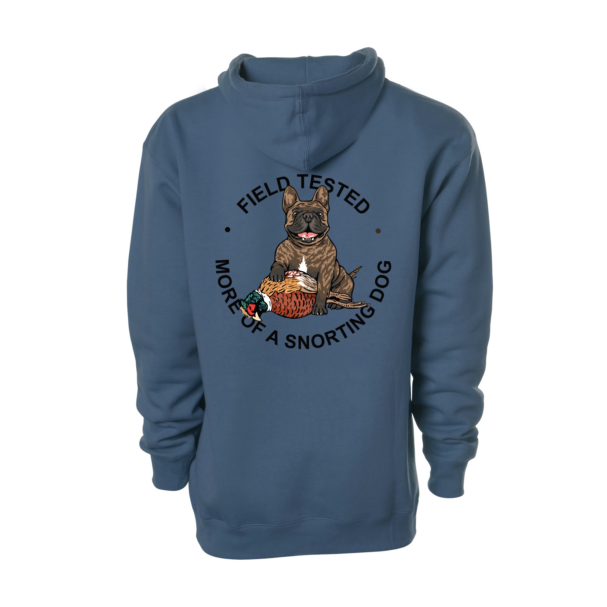 This Hunting French Bulldog pullover hoodie is bound to provide instant comedy for anyone who owns this snorting little sidekick–whether they aspire to be a bird dog or not. The heavyweight brushed fleece sweatshirt will keep you warm in the field or at home, plus it’s soft and super comfortable. Made from a 10 oz. cotton and polyester blend with a generous fit. Available in Olive, Blaze Orange, Saddle and Storm Blue. The OLIVE color is a 13.5oz Super Heavyweight Premium cross-grain hooded pullover and the best French bulldog hoodie ever made.