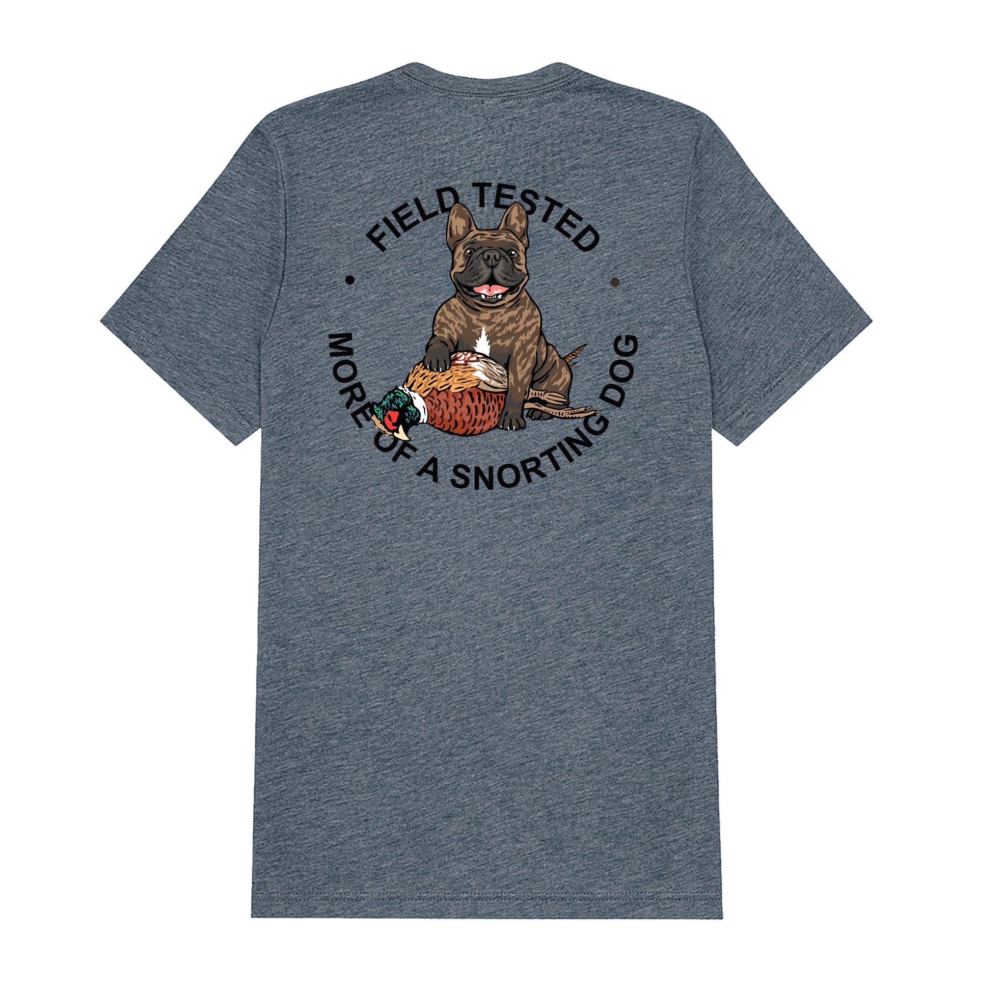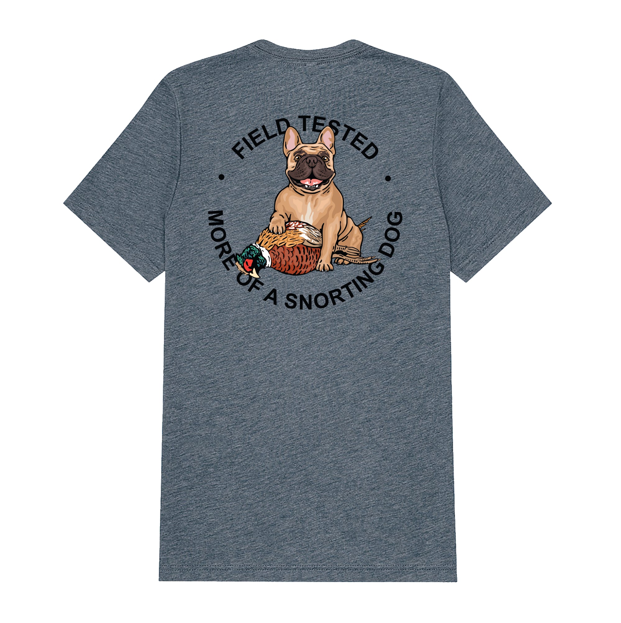 The Hunting French Bulldog Shirt is bound to provide instant comedy for anyone who owns this snorting little sidekick–whether they aspire to be a bird dog or not. This exceptionally soft and lightweight unisex short-sleeved tee is pre-shrunk and made with 50% polyester, 25% Airlume combed and ring-spun cotton, and 25% rayon. Available in Olive, Blaze Orange, Grey, Tan and Denim colors.
