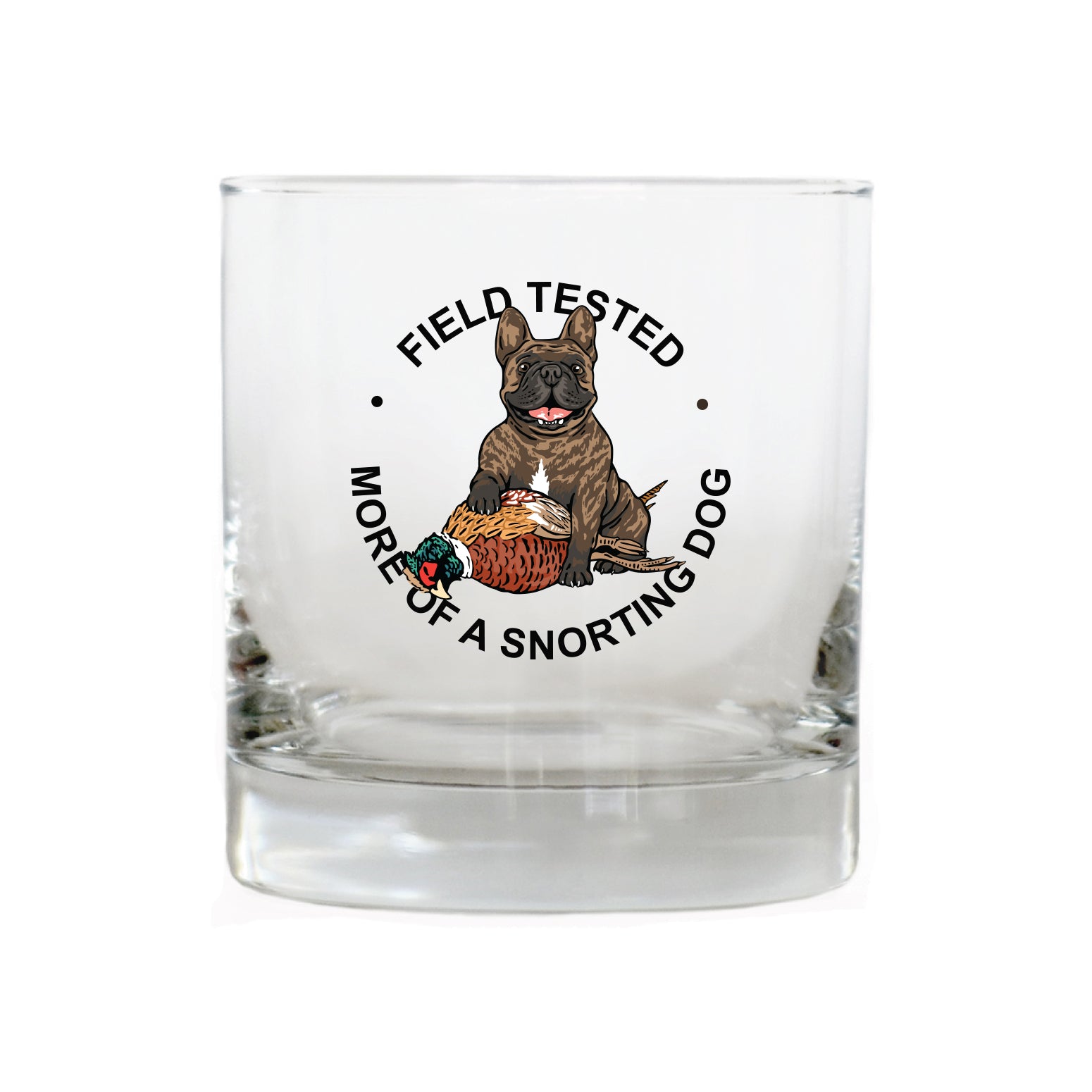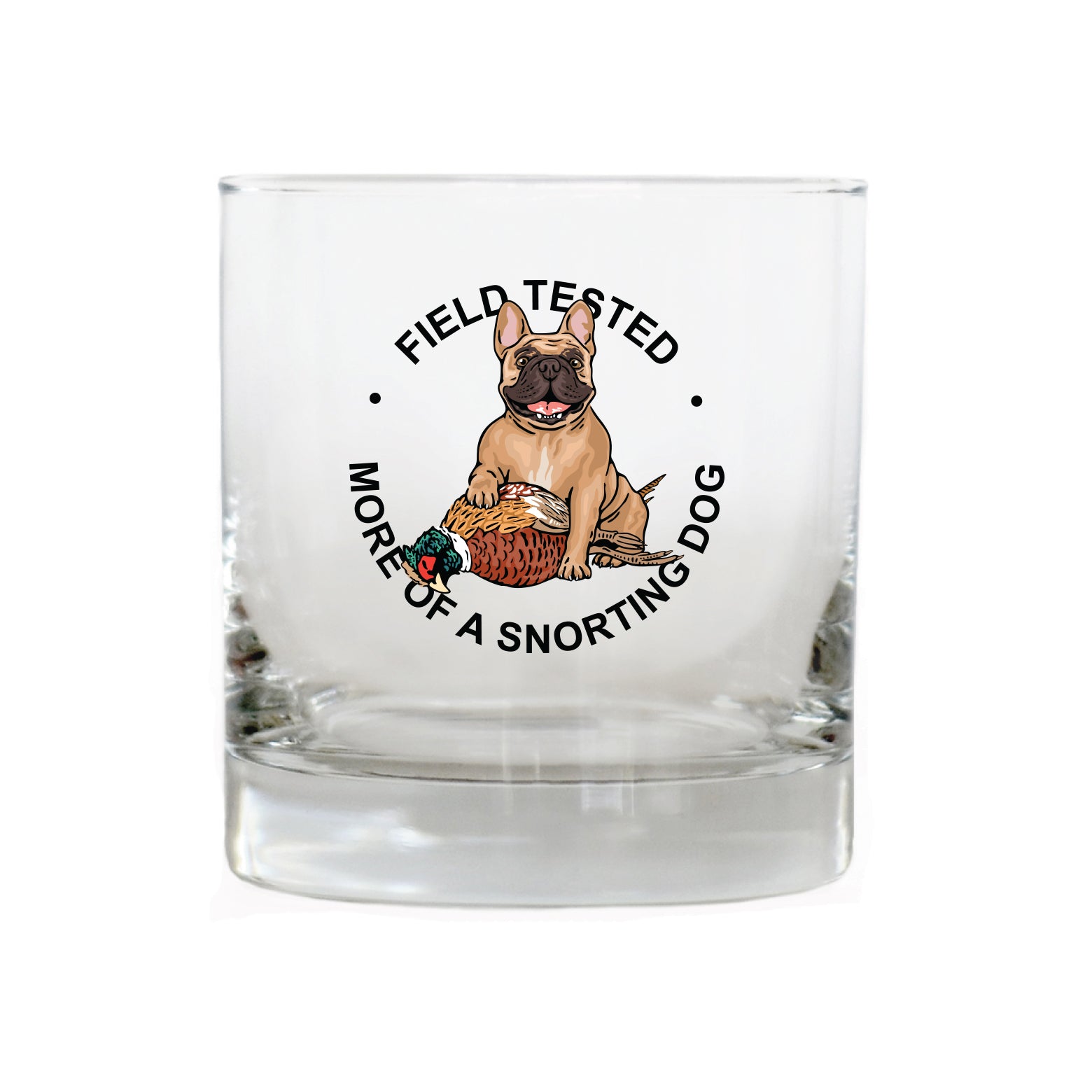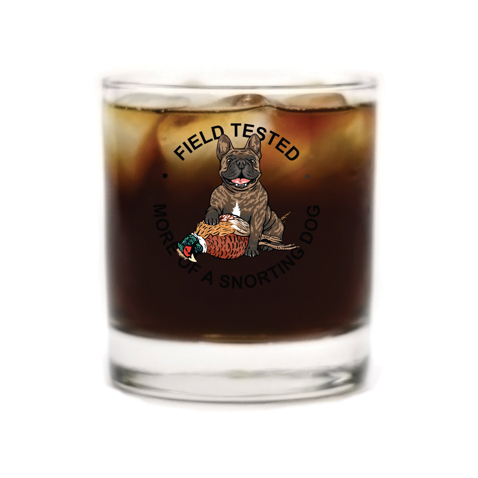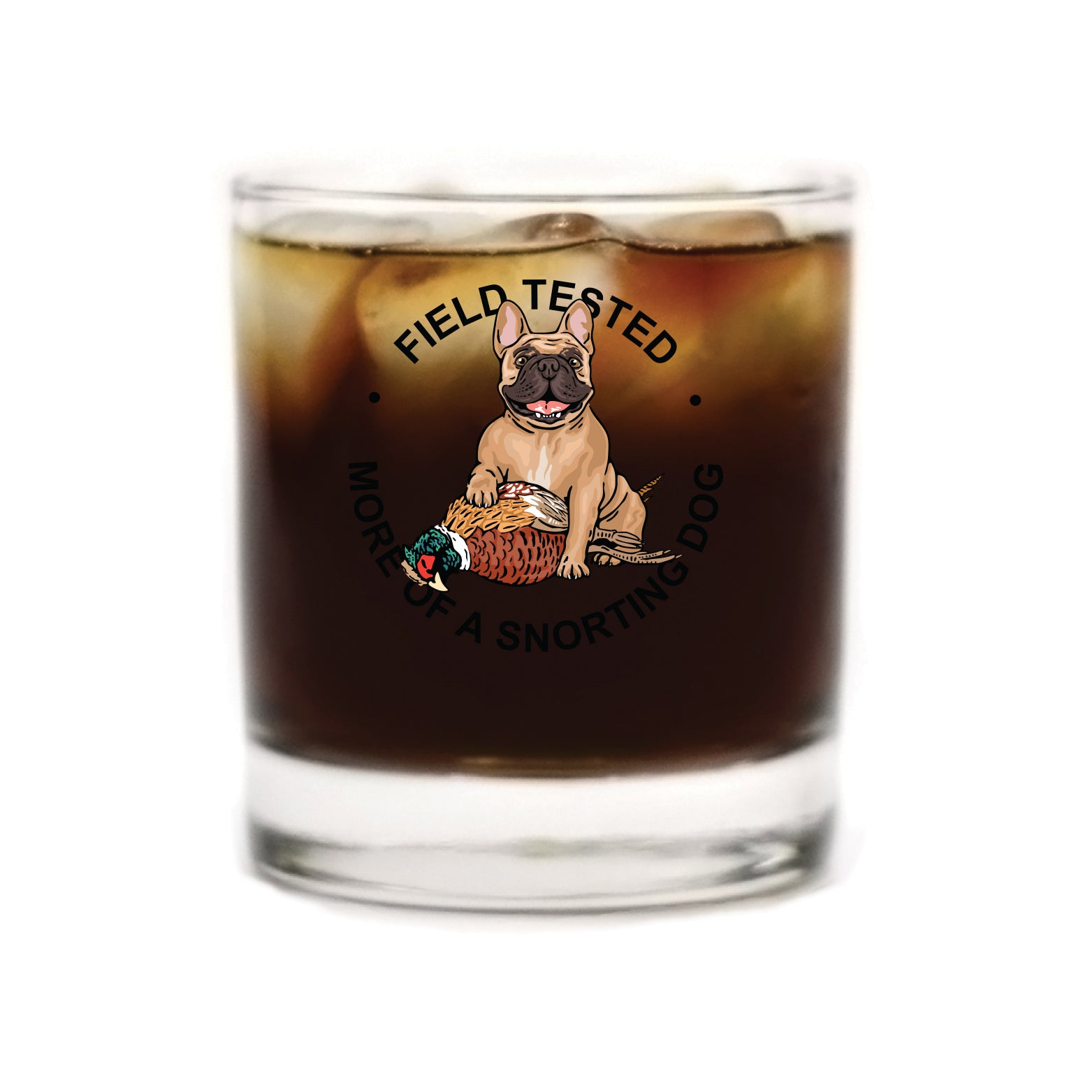 Celebrate your favorite couch companion with this 11oz Hunting French Bulldog Whiskey Glass! This is the perfect gift for anyone who owns this snorting little sidekick (whether they aspire to be a bird dog or not), to add to their own glassware collection or give as a memorable keepsake. Each glass has the "Bird Dog of the Day" logo engraved on the bottom of the glass, resulting in a beautiful surprise as you finish your drink. This lowball whiskey tumbler is perfect for a bourbon Old Fashioned or your favorite top-shelf drink.