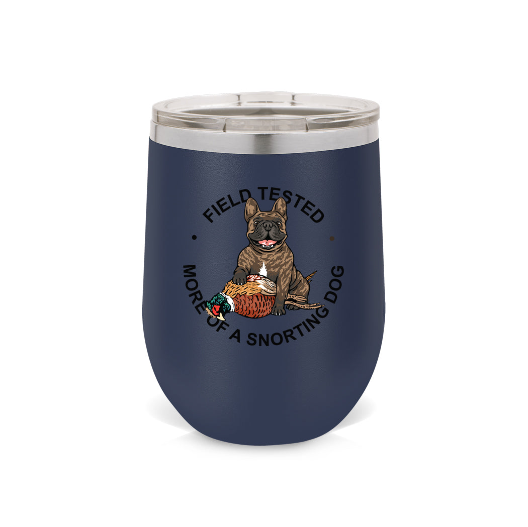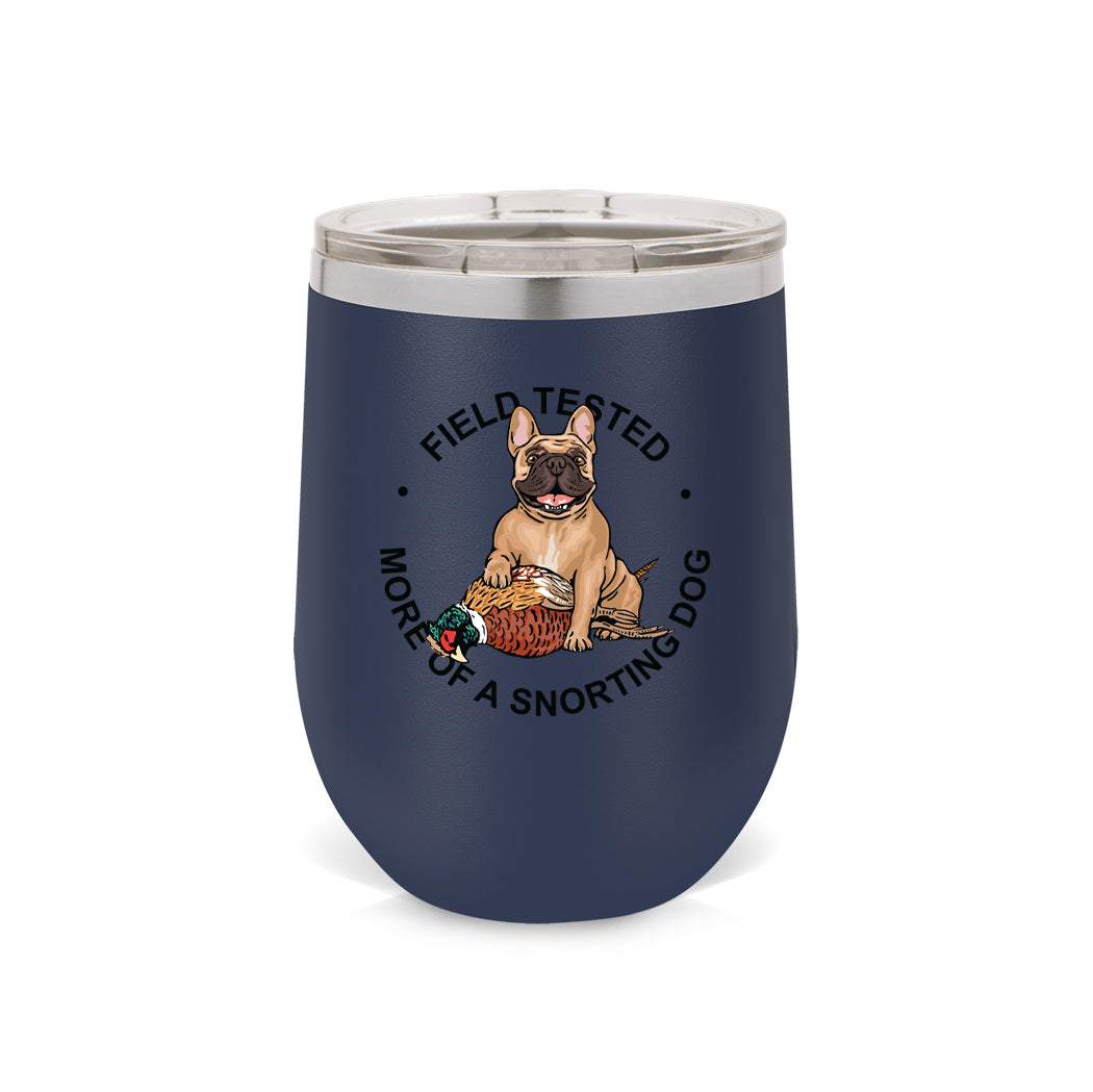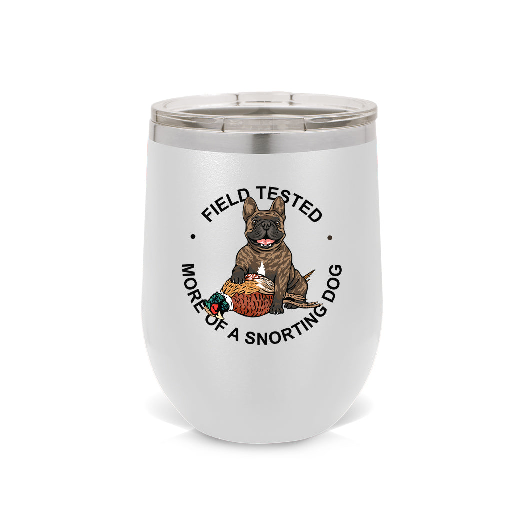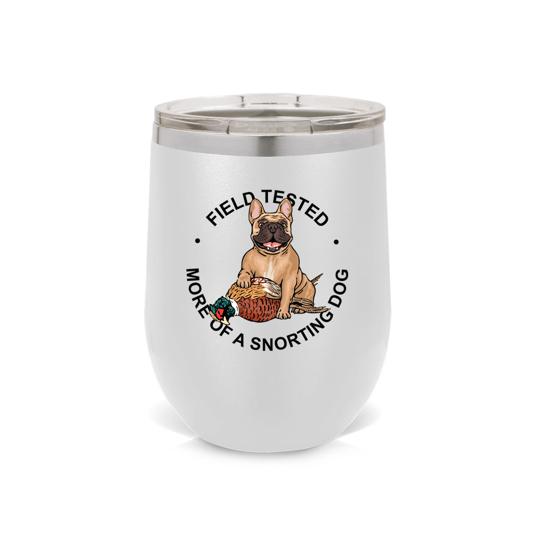 Our 12 oz Hunting French Bulldog wine tumbler goes where glass can't and keeps wine safe from warm hands. This is the perfect gift for anyone who owns this snorting little sidekick (whether they aspire to be a bird dog or not). A great conversation piece at any gathering, whether on the back deck or around the tailgate. Avoid broken glass and keep your wine contained, at the perfect temperature, and safe from thirsty flies.