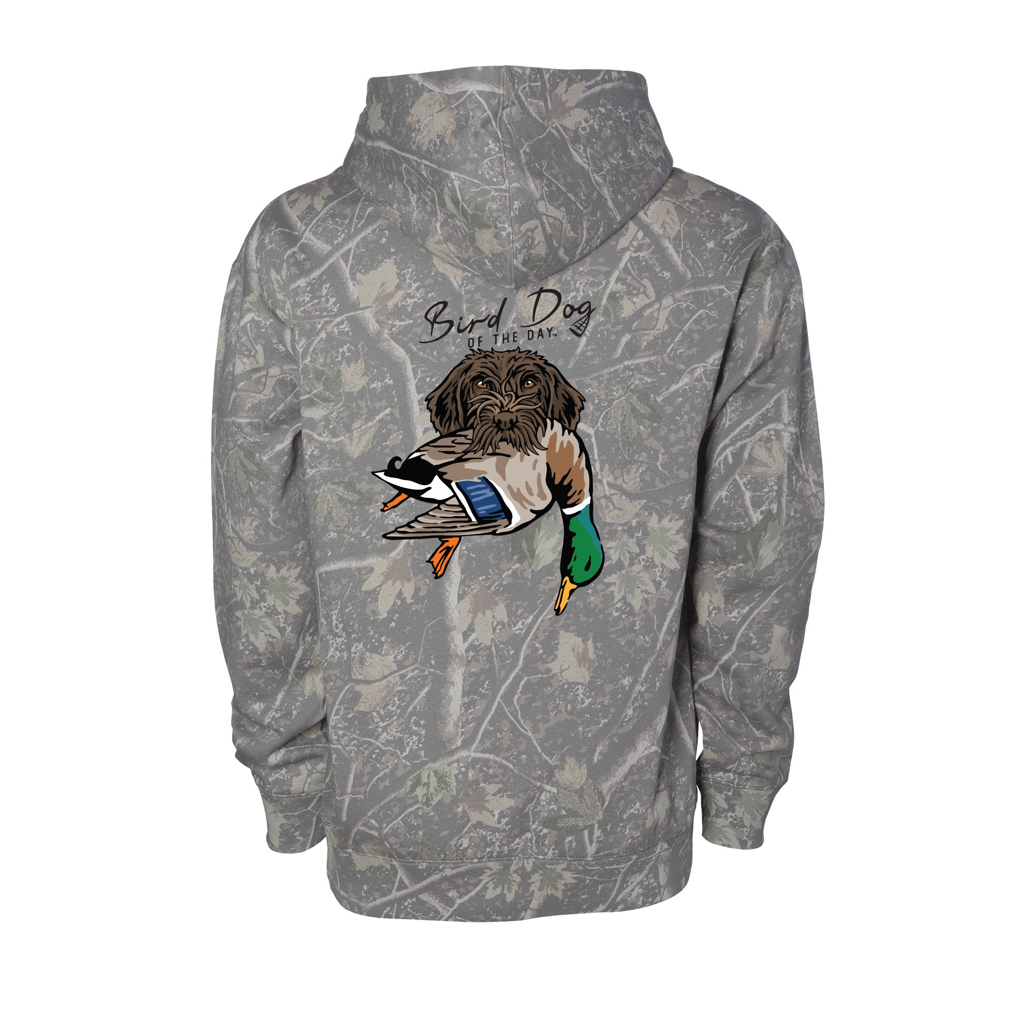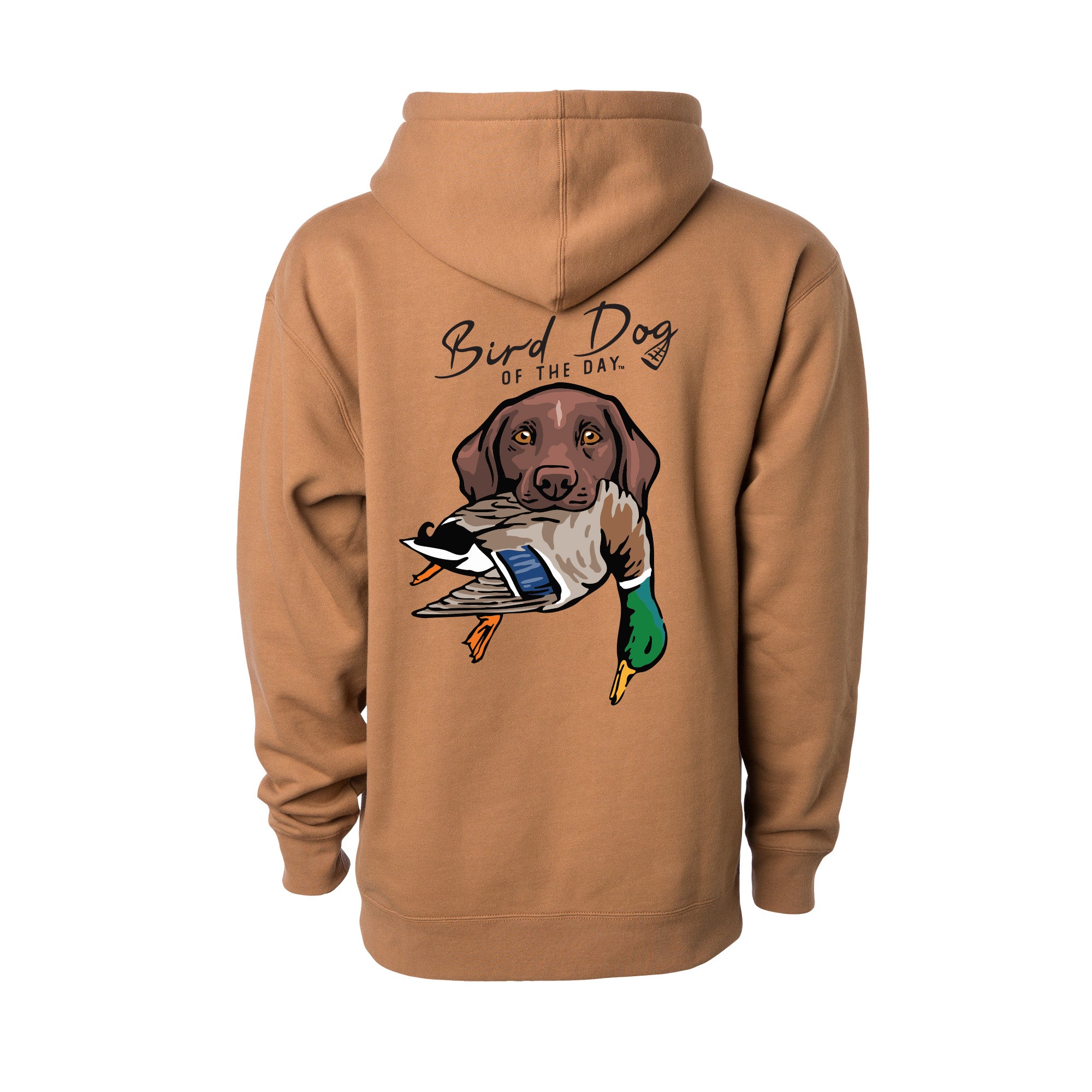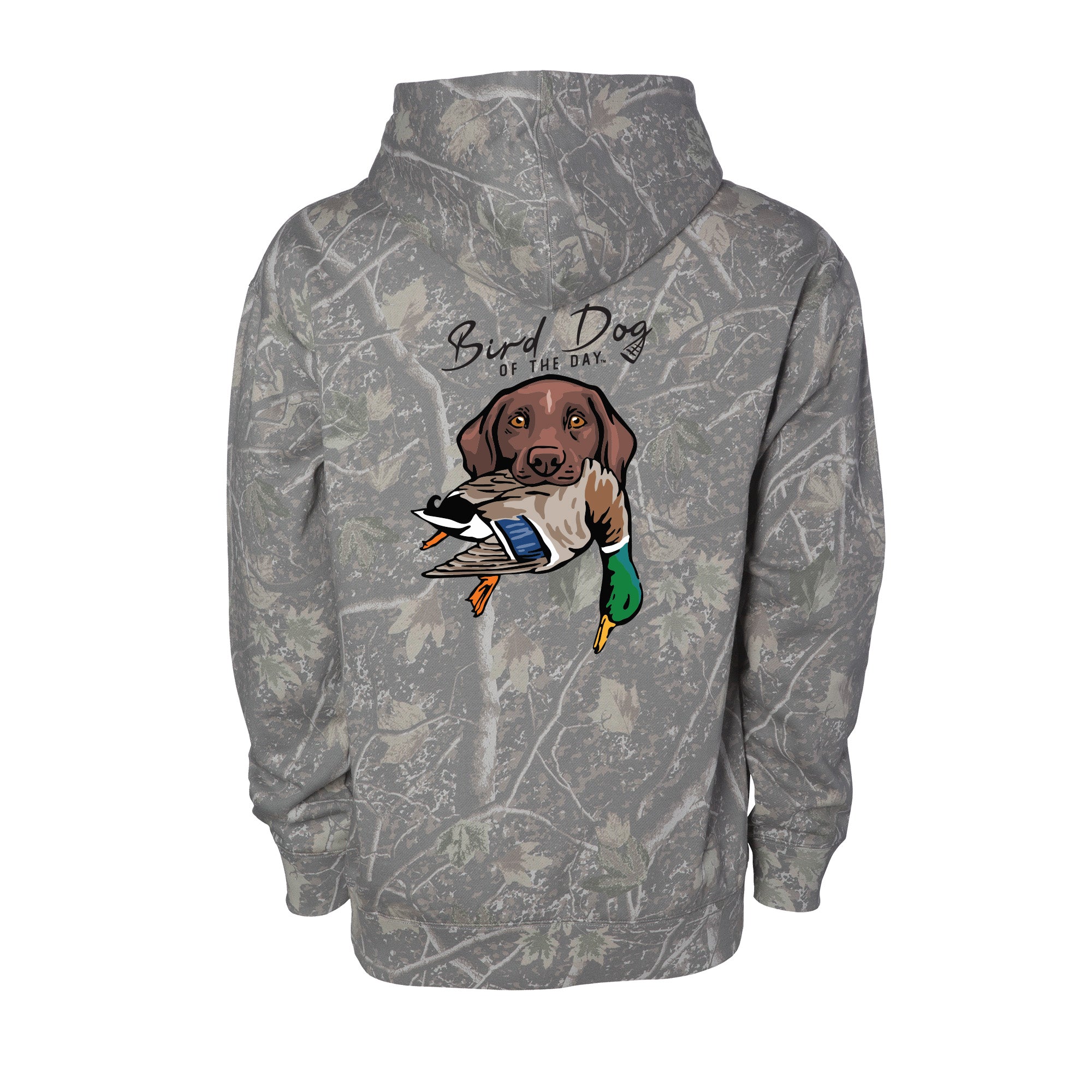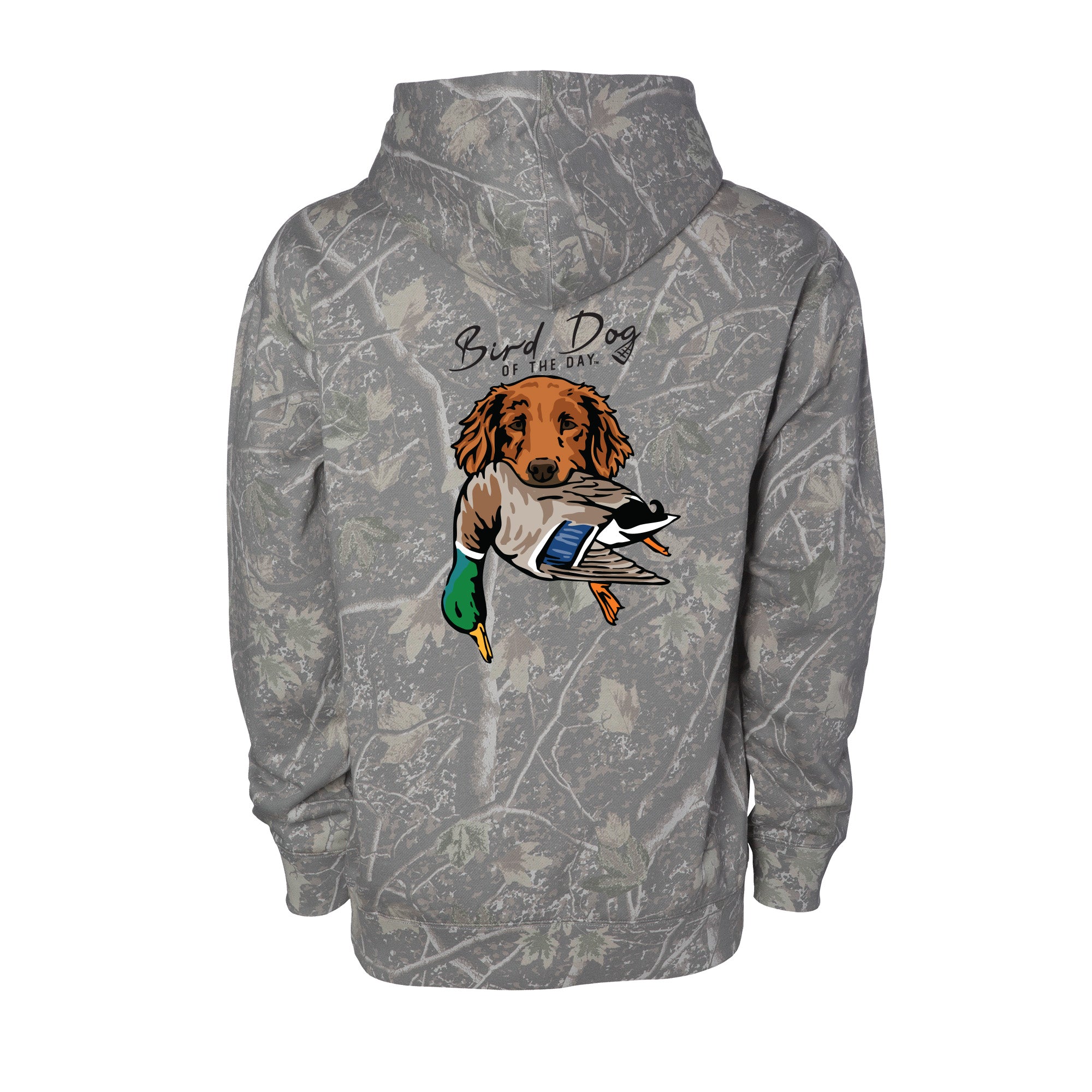 The backside has multiple options that include different duck dog breeds holding a mallard drake, as well as a classic blank backside option. If you're a duck hunter or duck dog owner, this hooded sweatshirt is made to be worn hard and often. The heavyweight brushed fleece will keep you warm in the field or at home, while staying soft and comfortable enough for everyday wear.