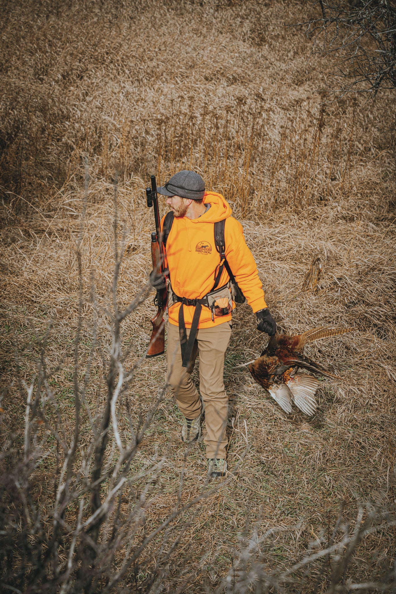 This pheasant pullover hoodie is bound to be an instant classic in winter. The heavyweight brushed fleece will keep you warm in the field or at home, plus it’s soft and super comfortable. Made from a 10 oz. cotton and polyester blend with a generous fit. Available in Olive, Blaze Orange, Saddle and Storm Blue. The OLIVE color is a 13.5oz Super Heavyweight Premium cross-grain hooded pullover and the best pheasant hoodie ever made.