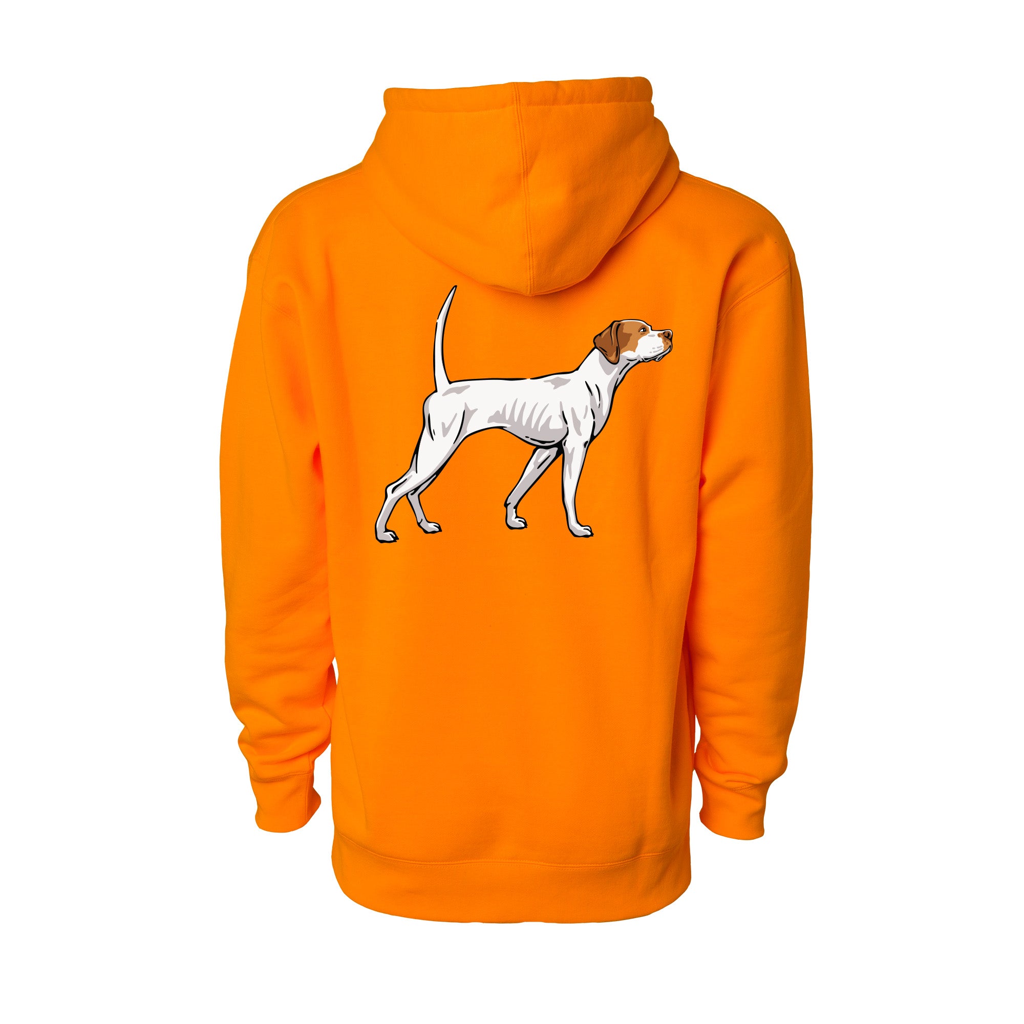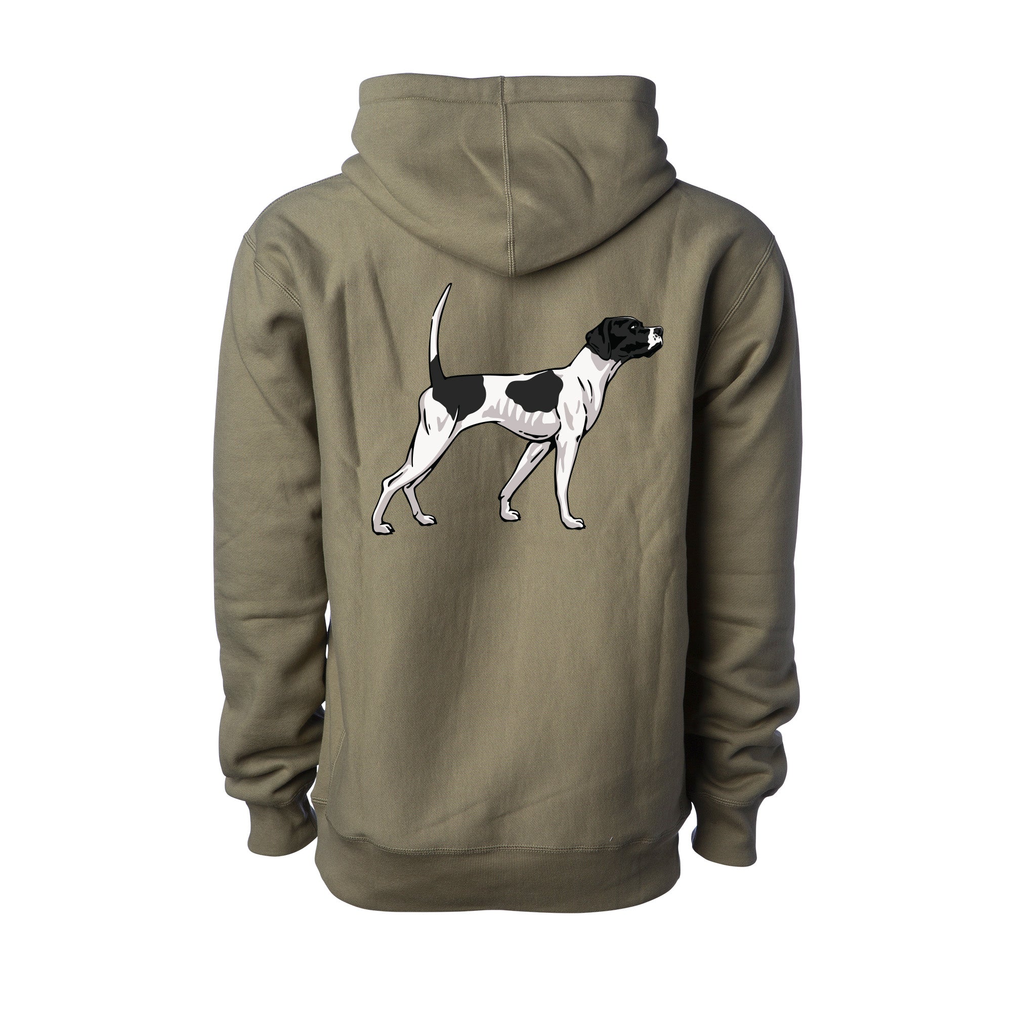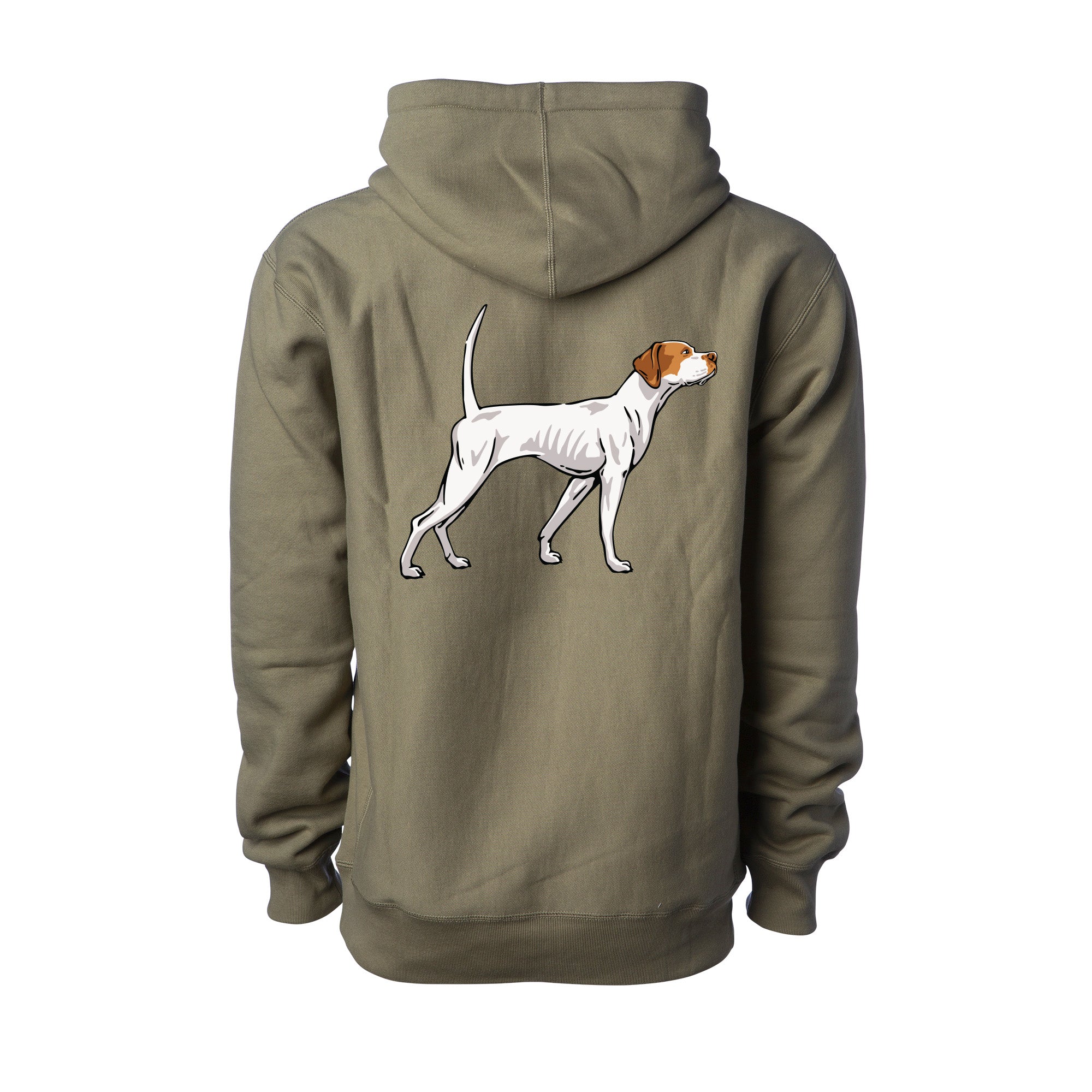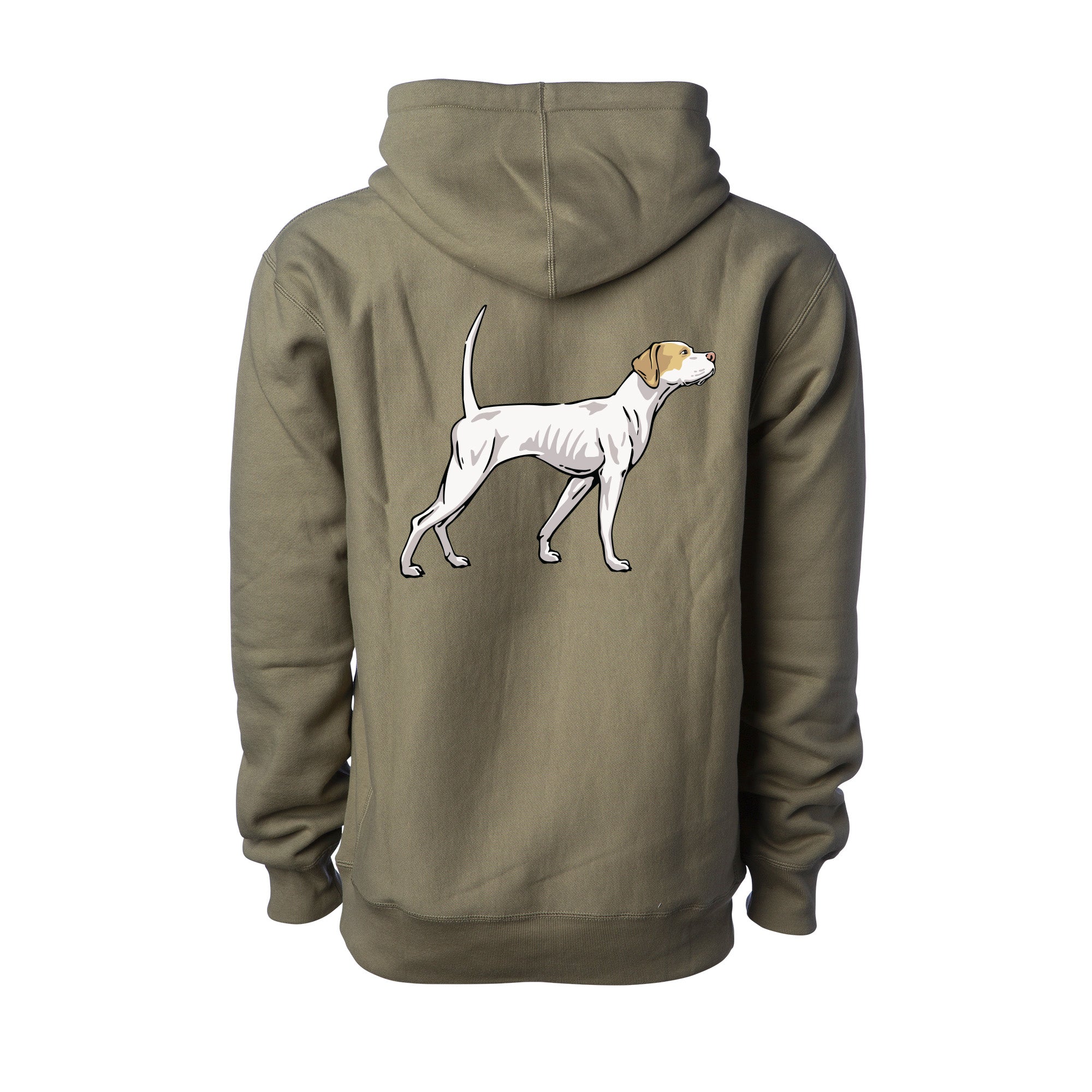 This Pointer pullover hoodie is bound to be an instant classic for cold weather. If you're into (English) pointers, you'll love repping this hooded sweatshirt. The heavyweight brushed fleece will keep you warm in the field or at home, plus it’s soft and super comfortable. Made from a 10 oz. cotton and polyester blend with a generous fit. Available in Olive, Saddle, Blaze Orange, Heather Grey and Storm Blue. The OLIVE color is a 13.5oz Super Heavyweight Premium cross-grain hooded pullover and the best pointer hoodie ever made.