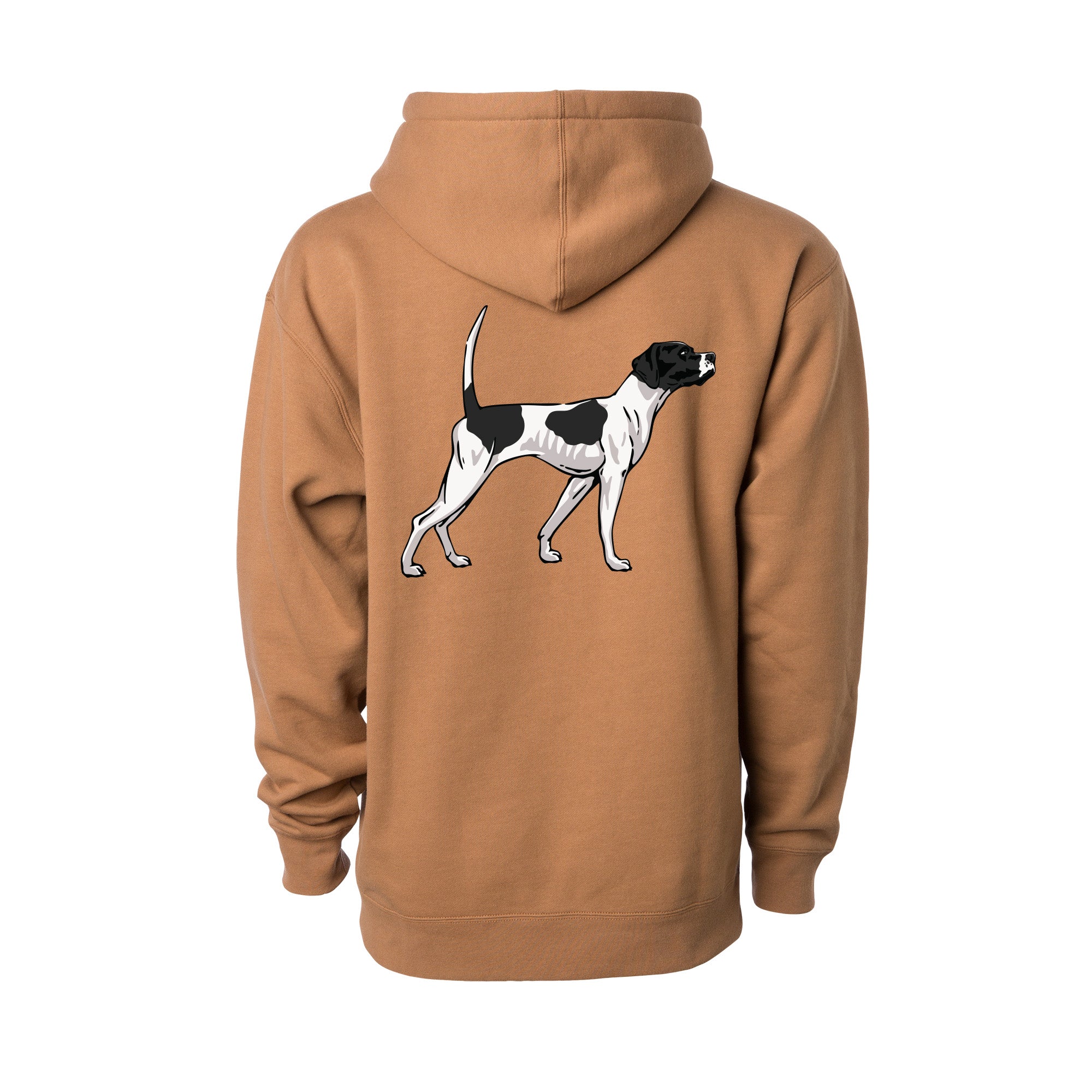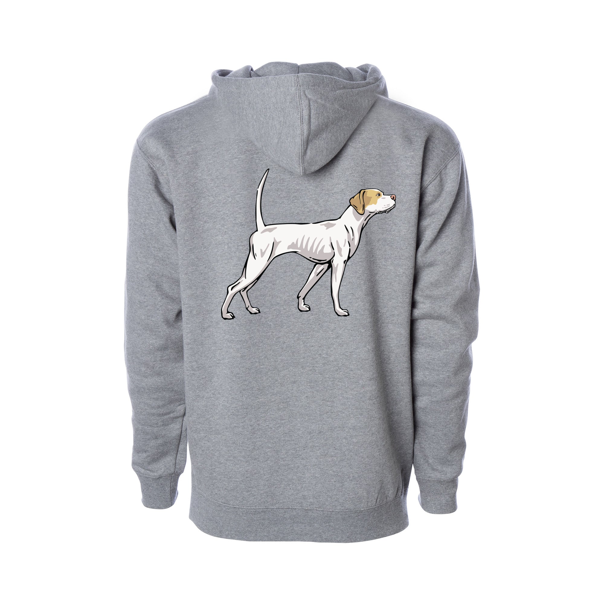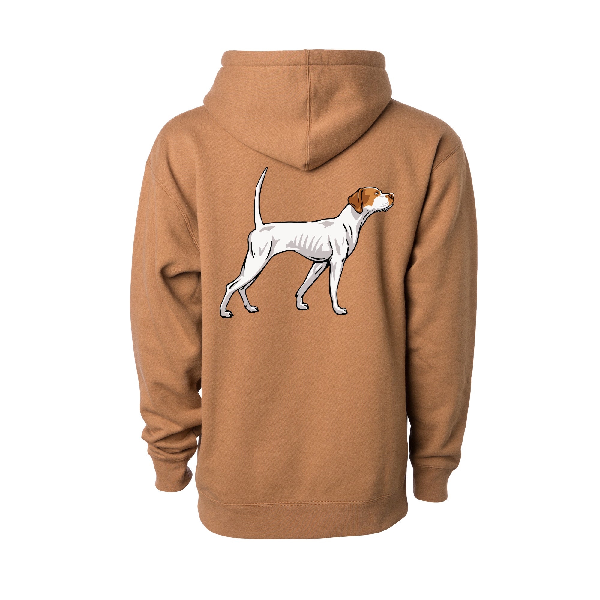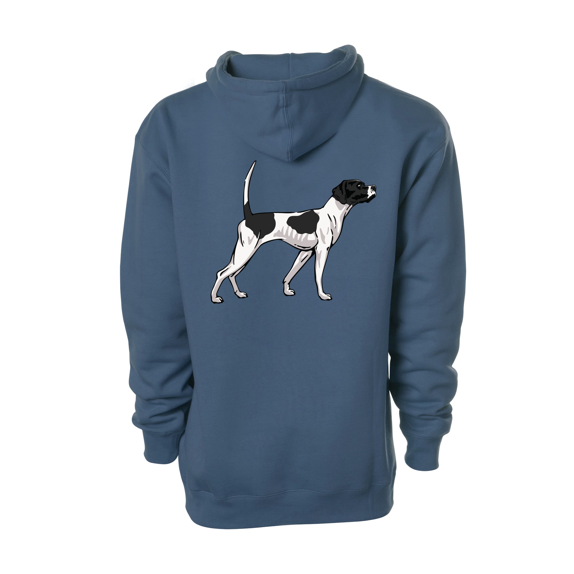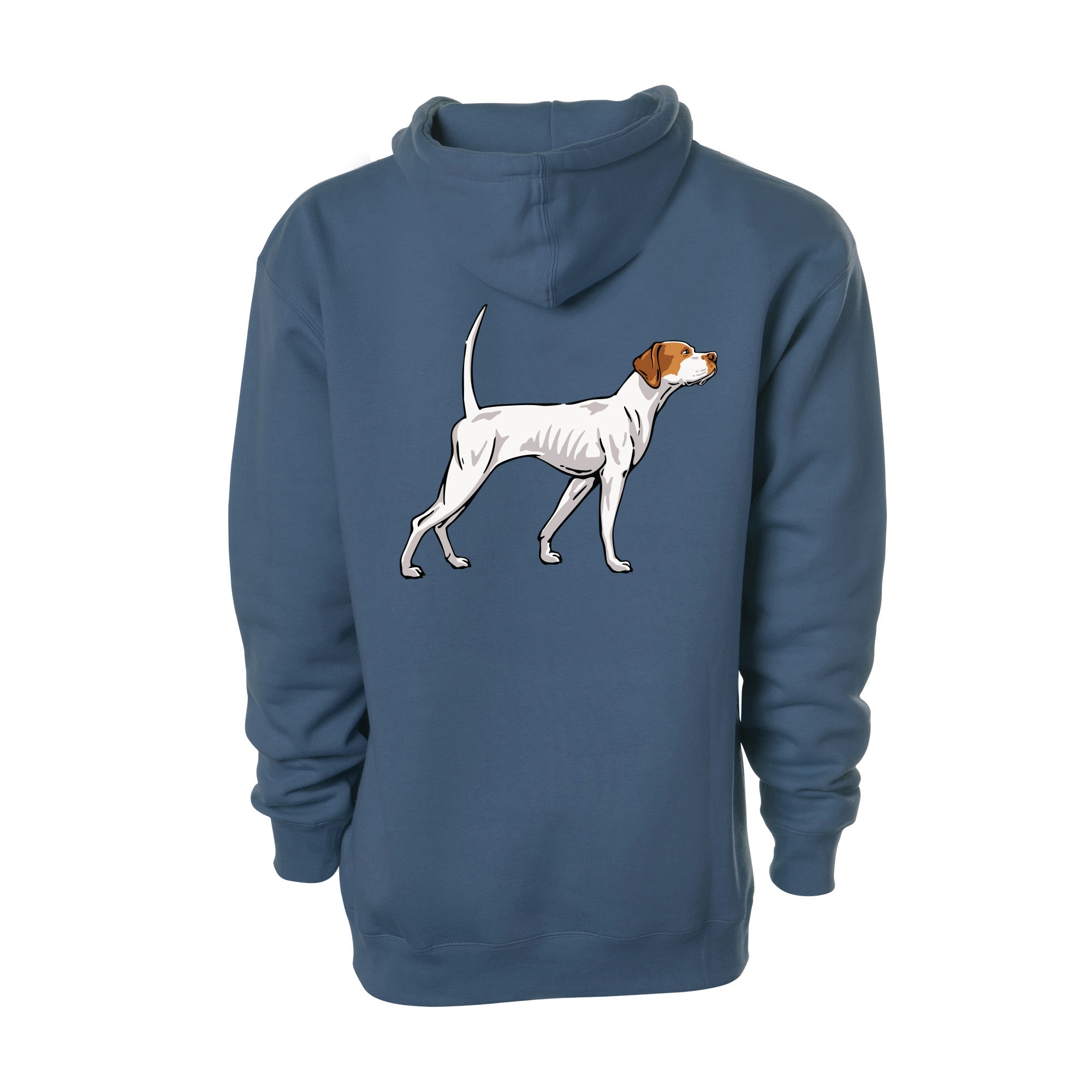 This Pointer pullover hoodie is bound to be an instant classic for cold weather. If you're into (English) pointers, you'll love repping this hooded sweatshirt. The heavyweight brushed fleece will keep you warm in the field or at home, plus it’s soft and super comfortable. Made from a 10 oz. cotton and polyester blend with a generous fit. Available in Olive, Saddle, Blaze Orange, Heather Grey and Storm Blue. The OLIVE color is a 13.5oz Super Heavyweight Premium cross-grain hooded pullover and the best pointer hoodie ever made.
