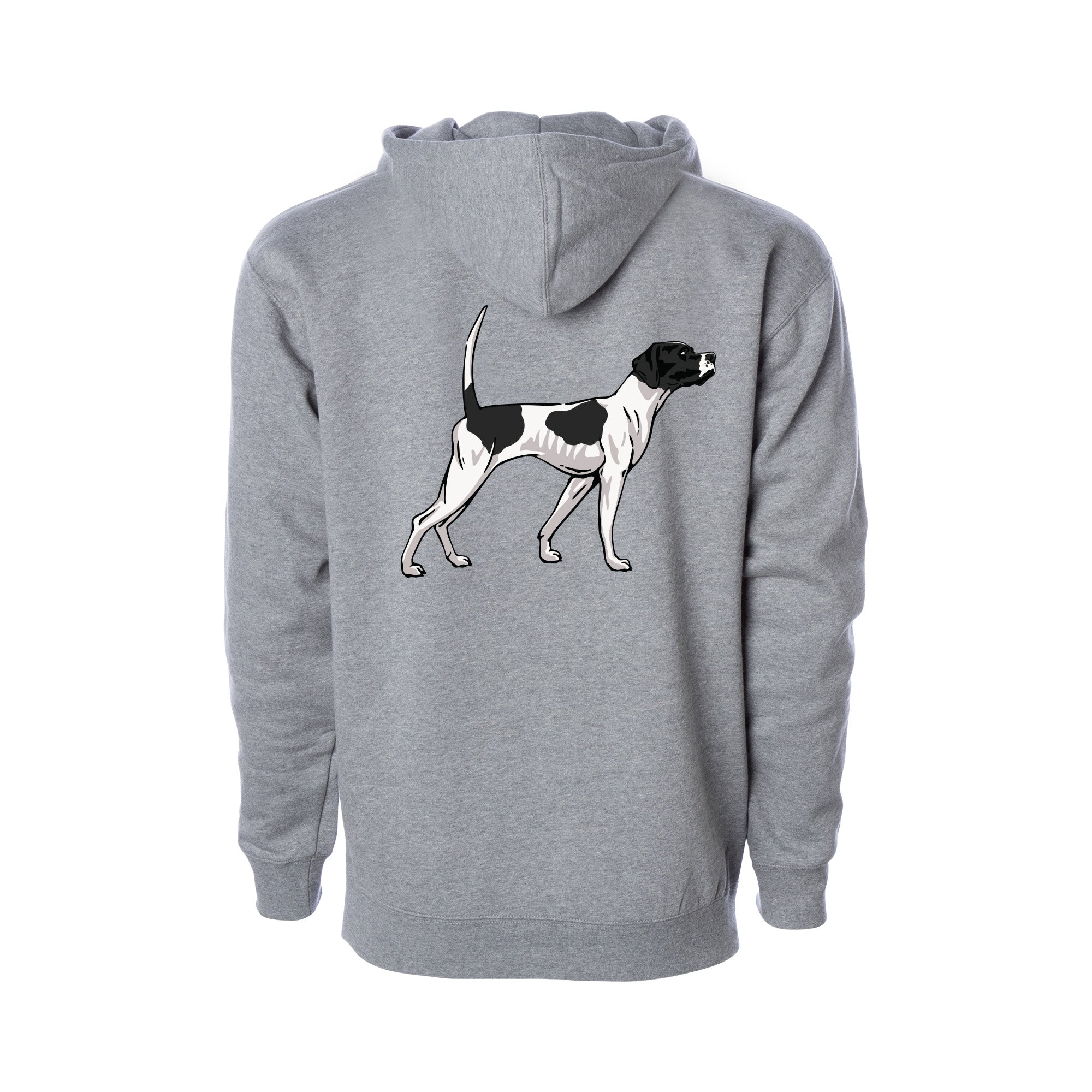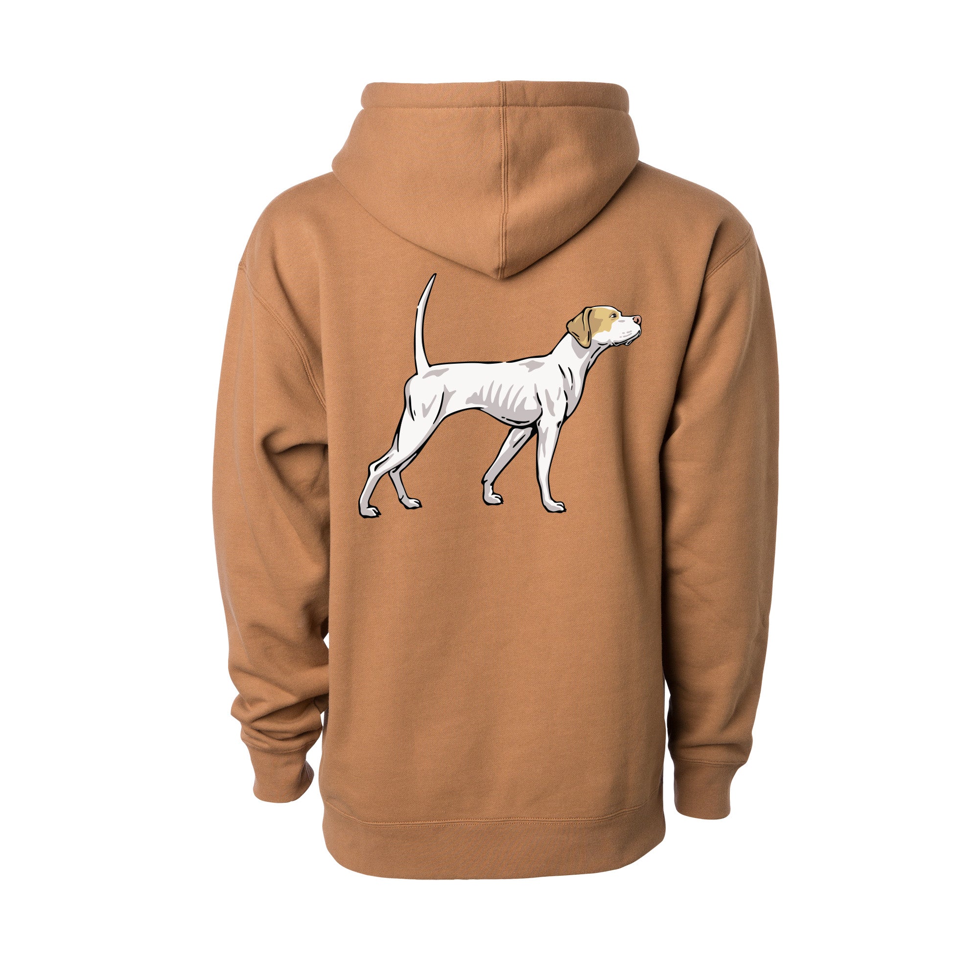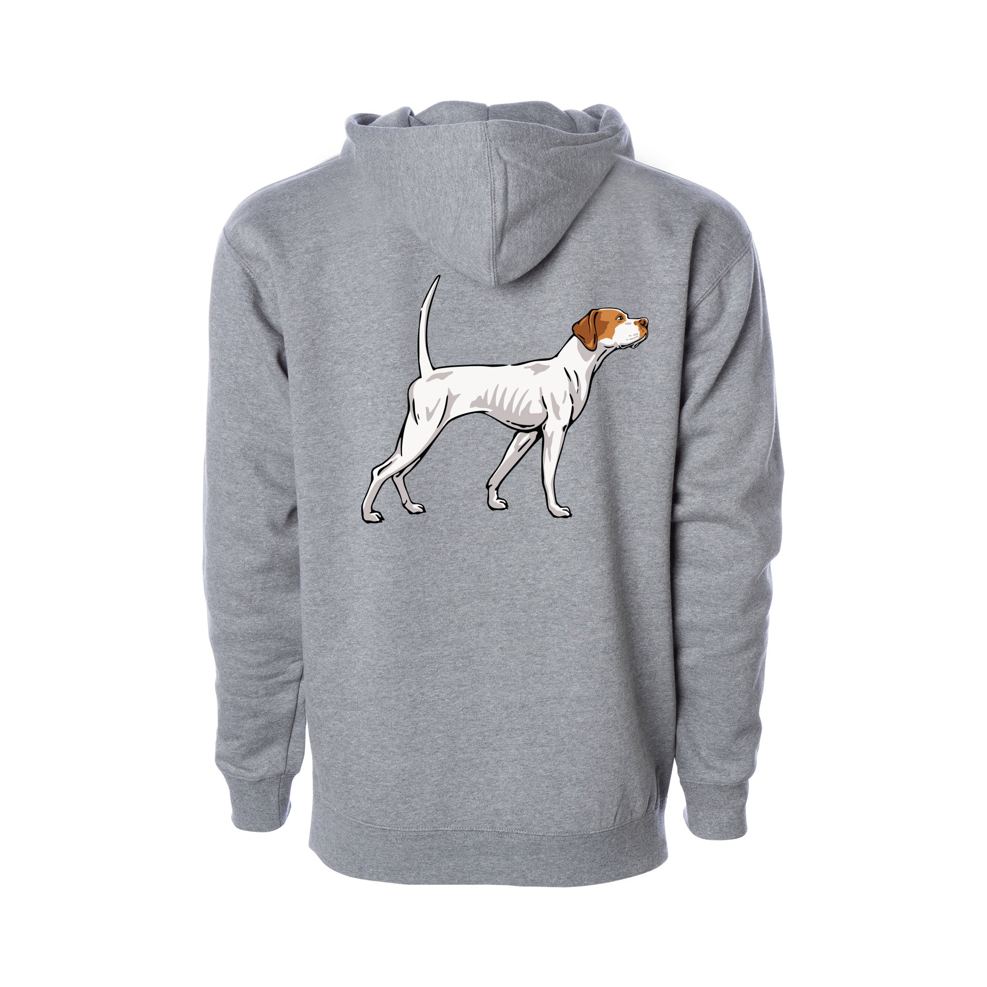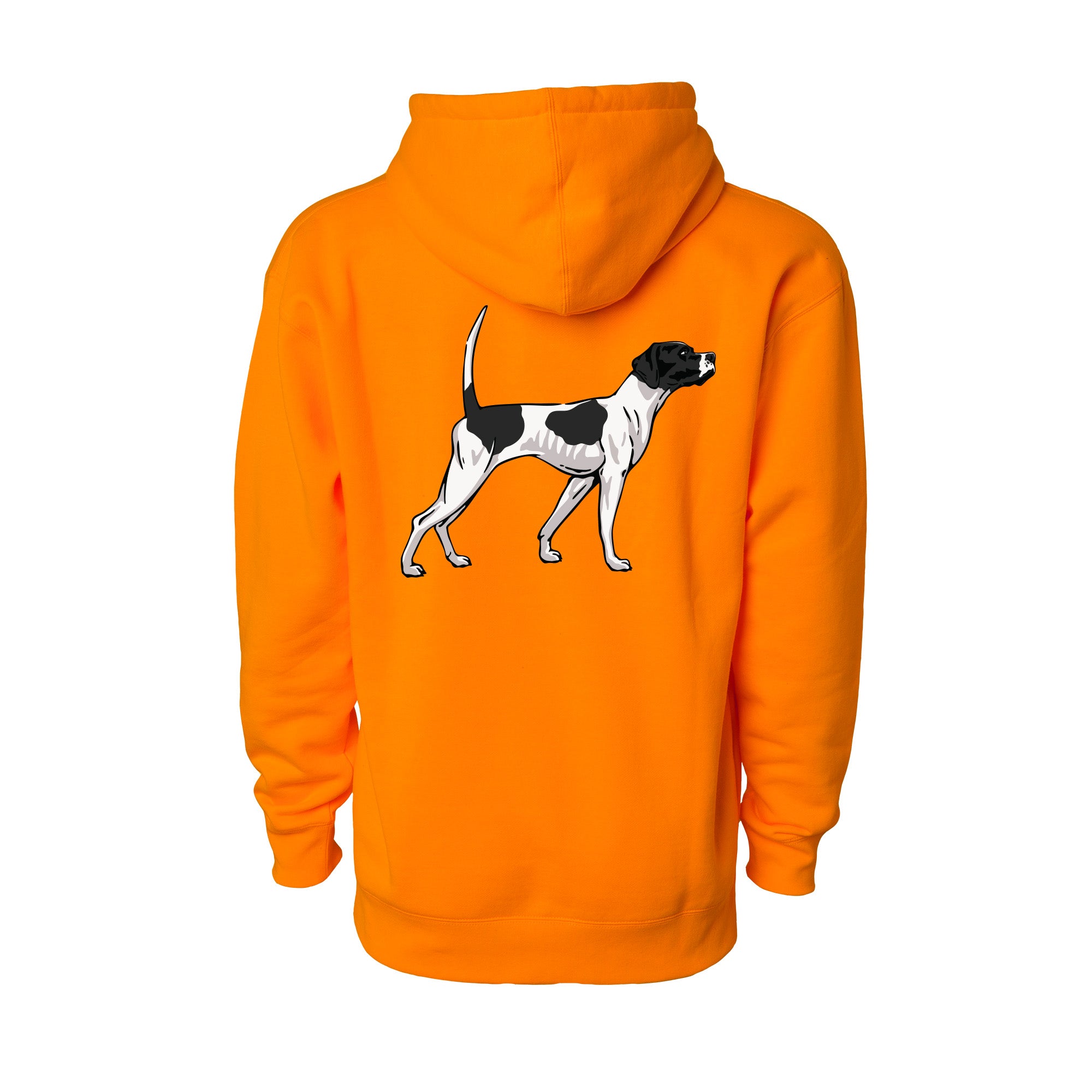 This Pointer pullover hoodie is bound to be an instant classic for cold weather. If you're into (English) pointers, you'll love repping this hooded sweatshirt. The heavyweight brushed fleece will keep you warm in the field or at home, plus it’s soft and super comfortable. Made from a 10 oz. cotton and polyester blend with a generous fit. Available in Olive, Saddle, Blaze Orange, Heather Grey and Storm Blue. The OLIVE color is a 13.5oz Super Heavyweight Premium cross-grain hooded pullover and the best pointer hoodie ever made.