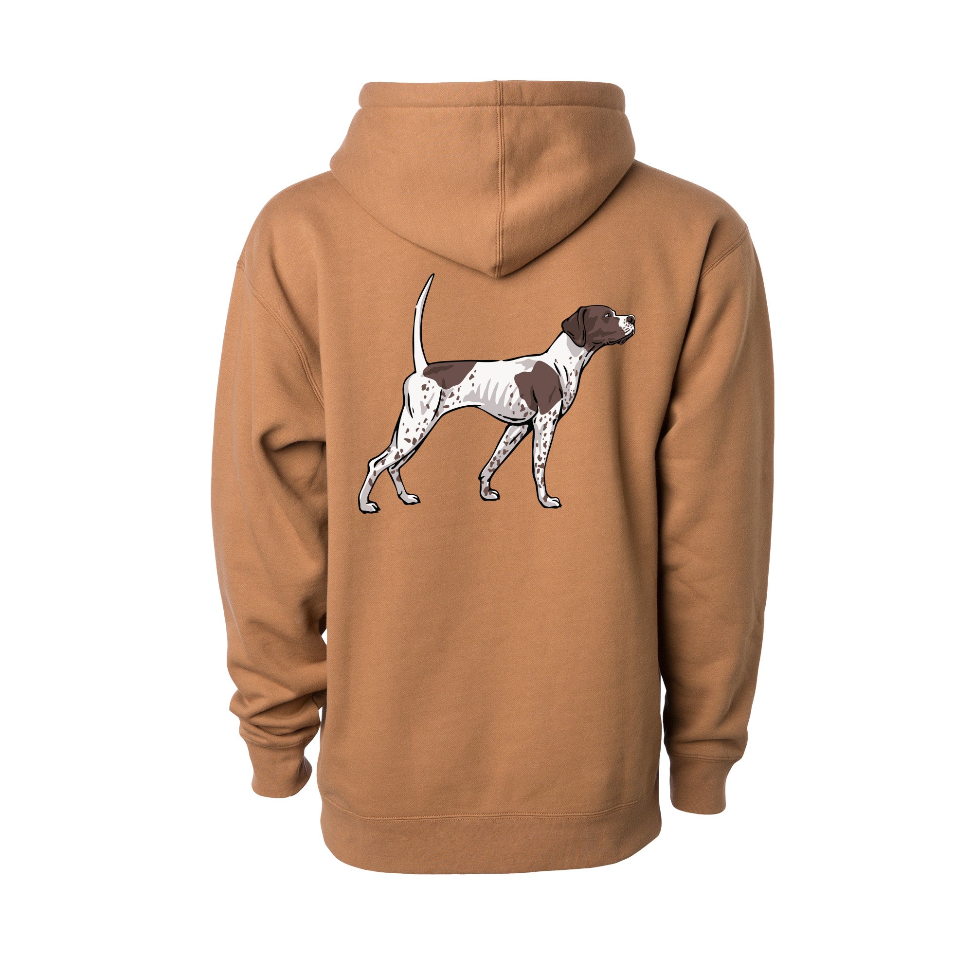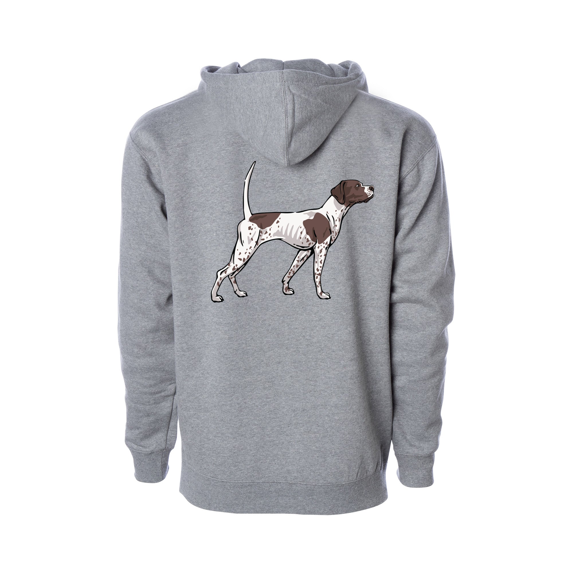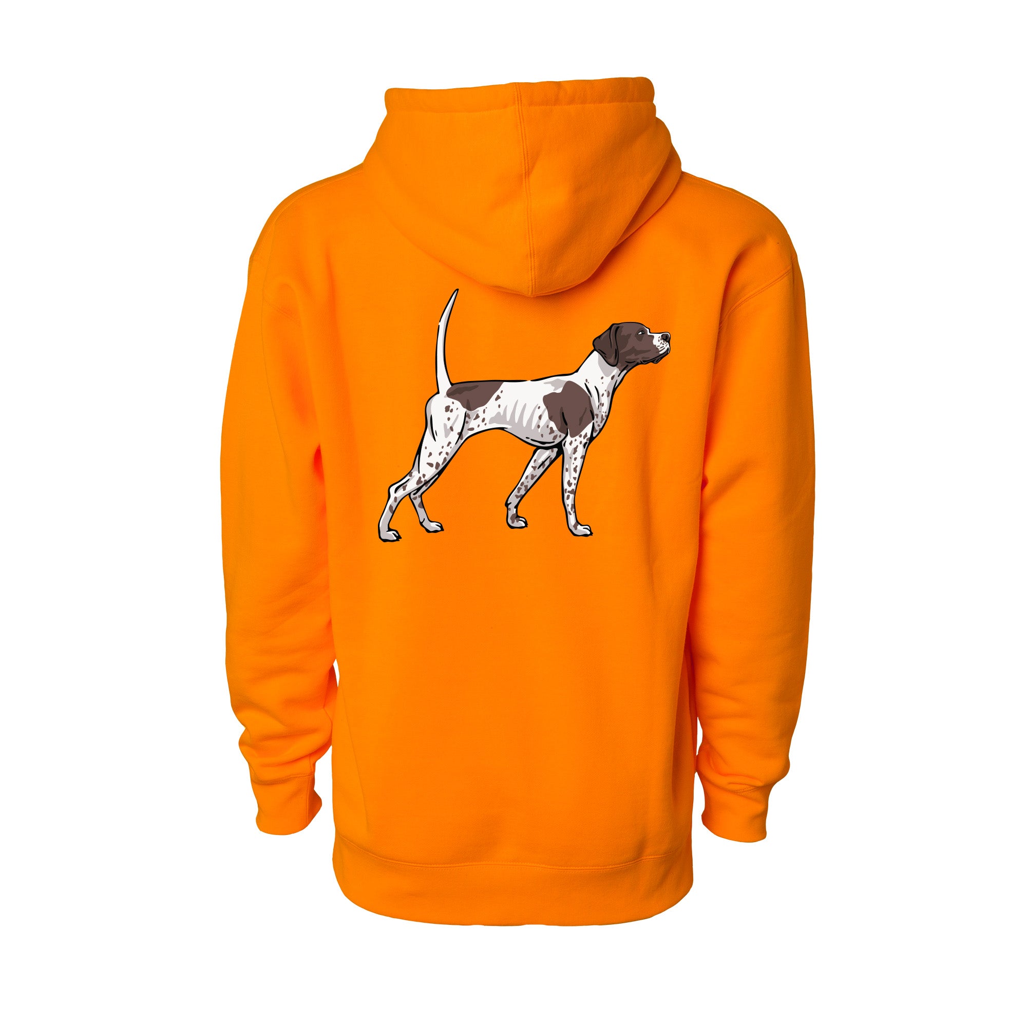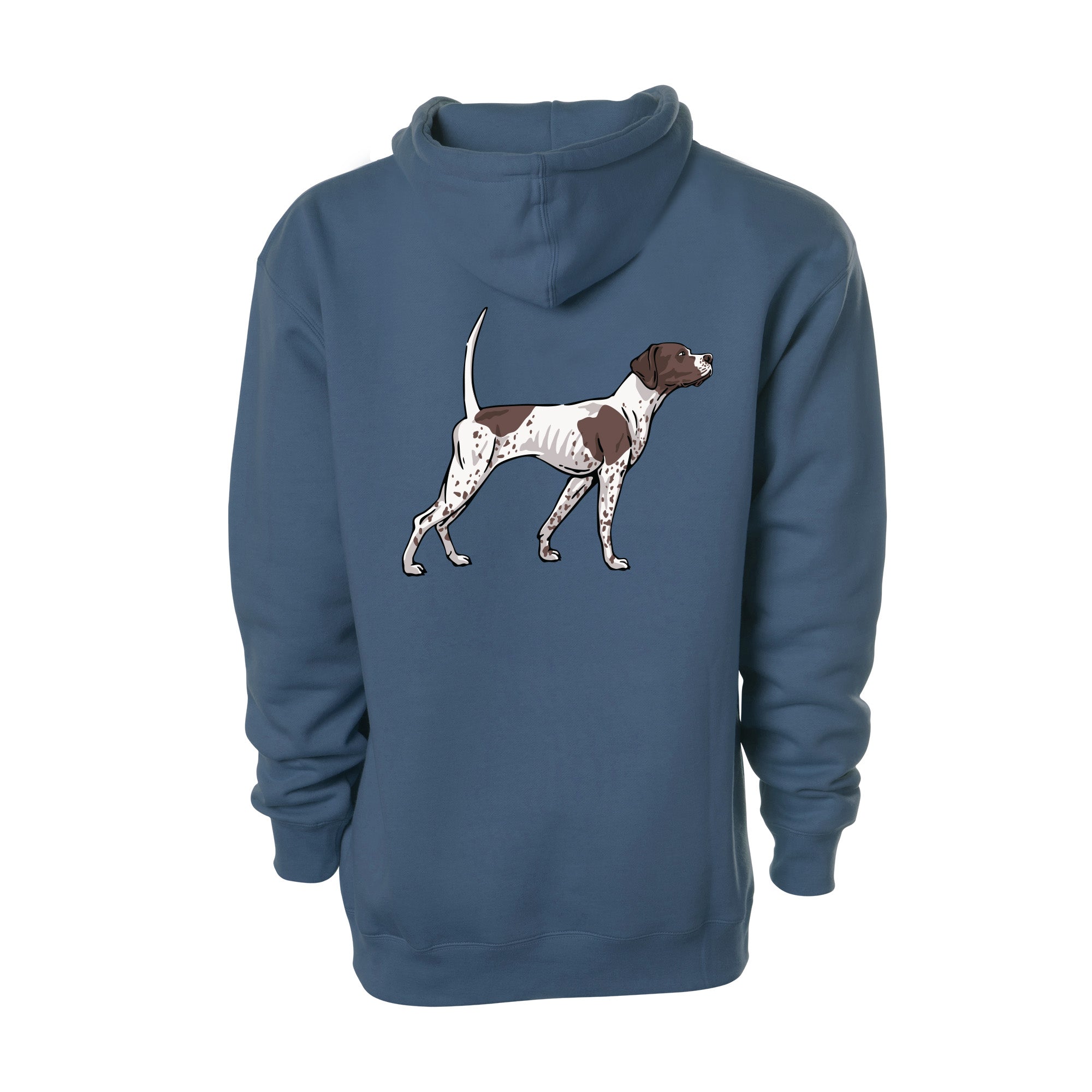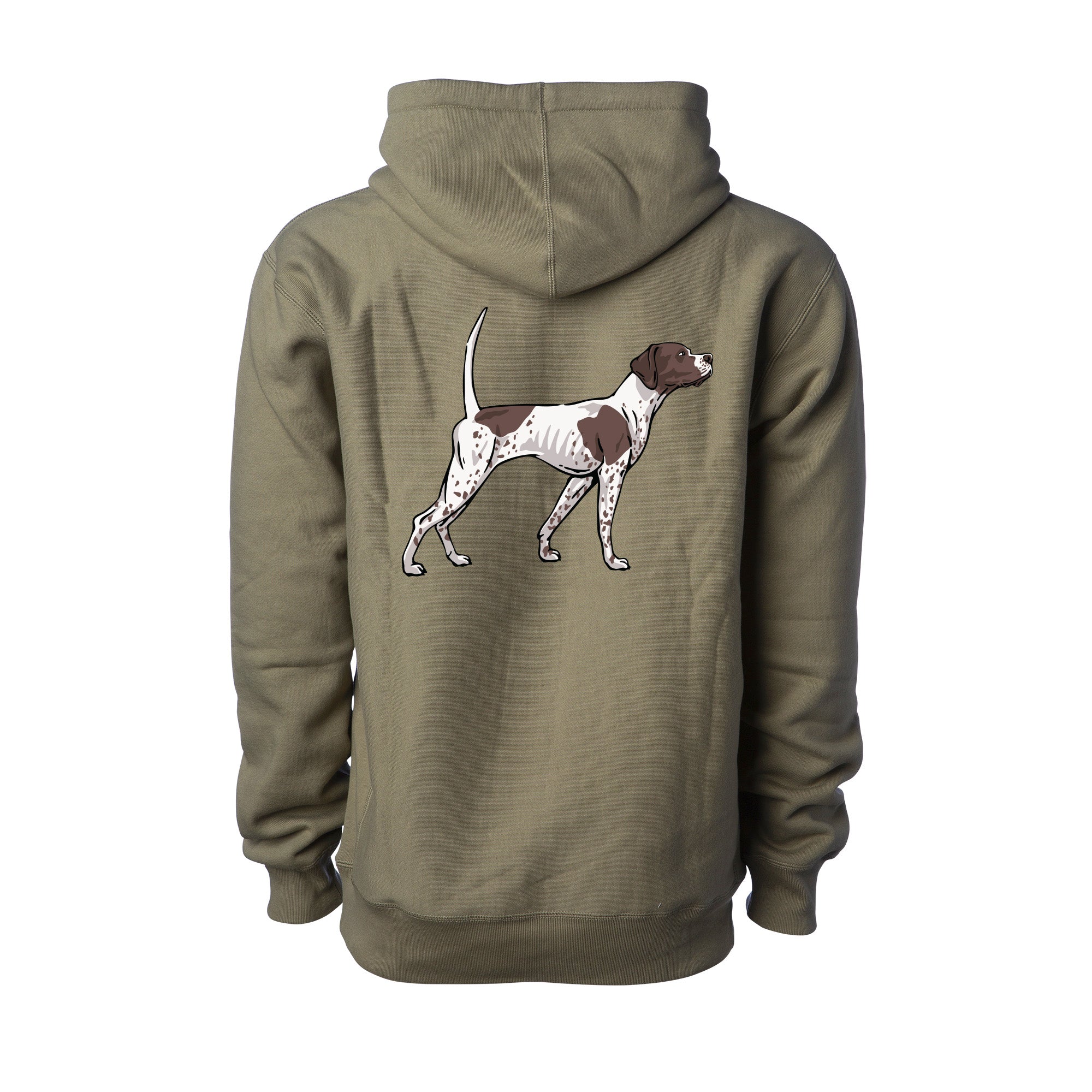 This Pointer pullover hoodie is bound to be an instant classic for cold weather. If you're into (English) pointers, you'll love repping this hooded sweatshirt. The heavyweight brushed fleece will keep you warm in the field or at home, plus it’s soft and super comfortable. Made from a 10 oz. cotton and polyester blend with a generous fit. Available in Olive, Saddle, Blaze Orange, Heather Grey and Storm Blue. The OLIVE color is a 13.5oz Super Heavyweight Premium cross-grain hooded pullover and the best pointer hoodie ever made.