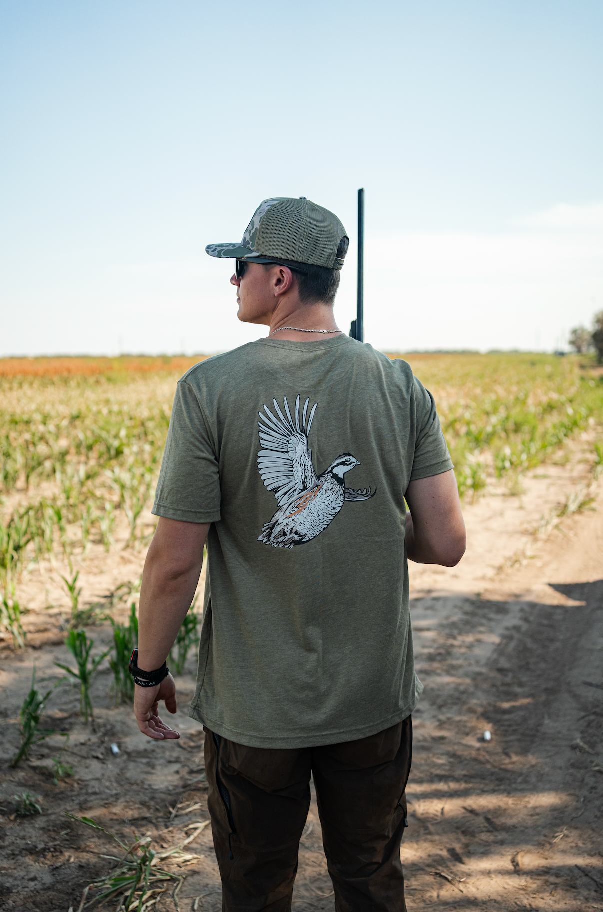 The Quail T-Shirt features a flushing bobwhite and is the perfect gift for anyone who loves quail. This exceptionally soft and lightweight unisex short-sleeved tee is pre-shrunk and made with 50% polyester, 25% Airlume combed and ring-spun cotton, and 25% rayon. Available in Olive, Tan and Denim colors.