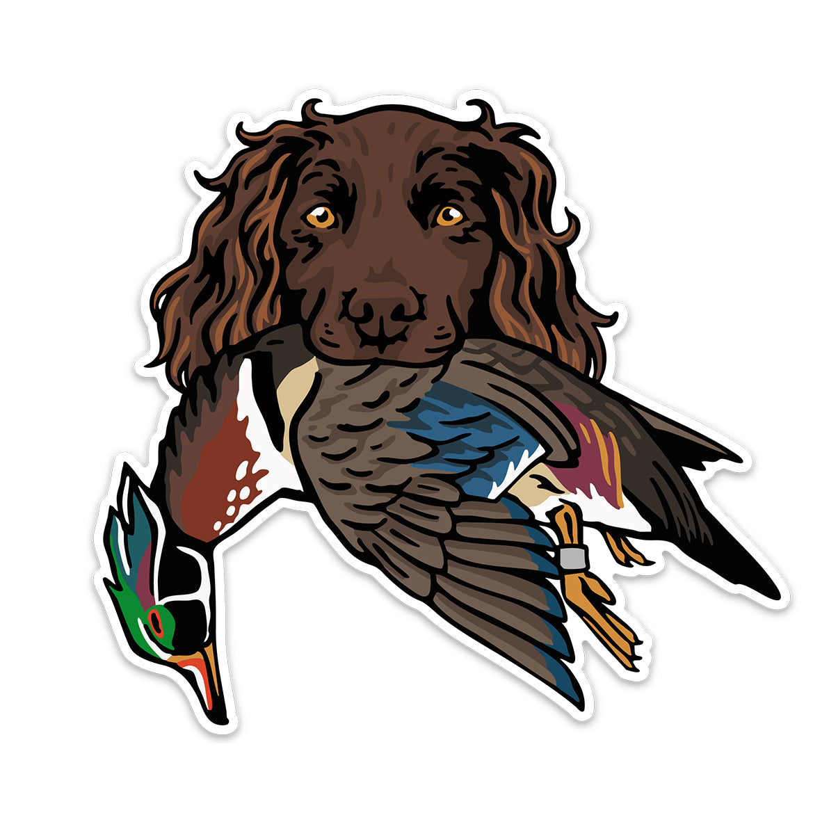 The Boykin Spaniel Bird Dog Decal Sticker celebrates one of the most versatile bird dogs in the field. Long favored in South Carolina's duck woods, the "little brown dog" in this design is proudly carrying a drake wood duck. Whether it's on your truck, cooler, dog box, or gun case, this decal represents a lifestyle built around bird dogs and the memories we cherish with them.
