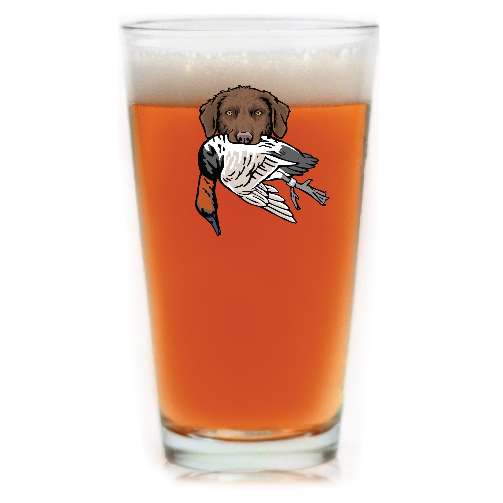 The Chesapeake Bay Retriever Bird Dog Pint Glass celebrates this legendary duck dog, built for cold water, long retrieves and all-day hunts. The chessie in this design is proudly carrying a canvasback drake. Whether it's poured after a long day afield or shared with friend at camp, this glass honors the bird dogs and seasons that shape the stories we carry home.