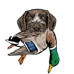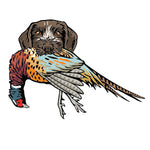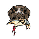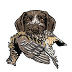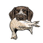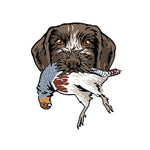 The German Wirehaired Pointer Bird Dog Decal Sticker celebrates one of the most versatile bird dogs in the field. Long favored in the uplands, the GWP in this design is proudly carrying a chukar. Whether it's on your truck, cooler, dog box, or gun case, this decal represents a lifestyle built around bird dogs and the memories we cherish with them.