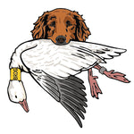 A classic Golden Retriever retrieving a storm wigeon drake, designed for bird hunters and golden owners who live for bird seasons and time afield with a good dog.