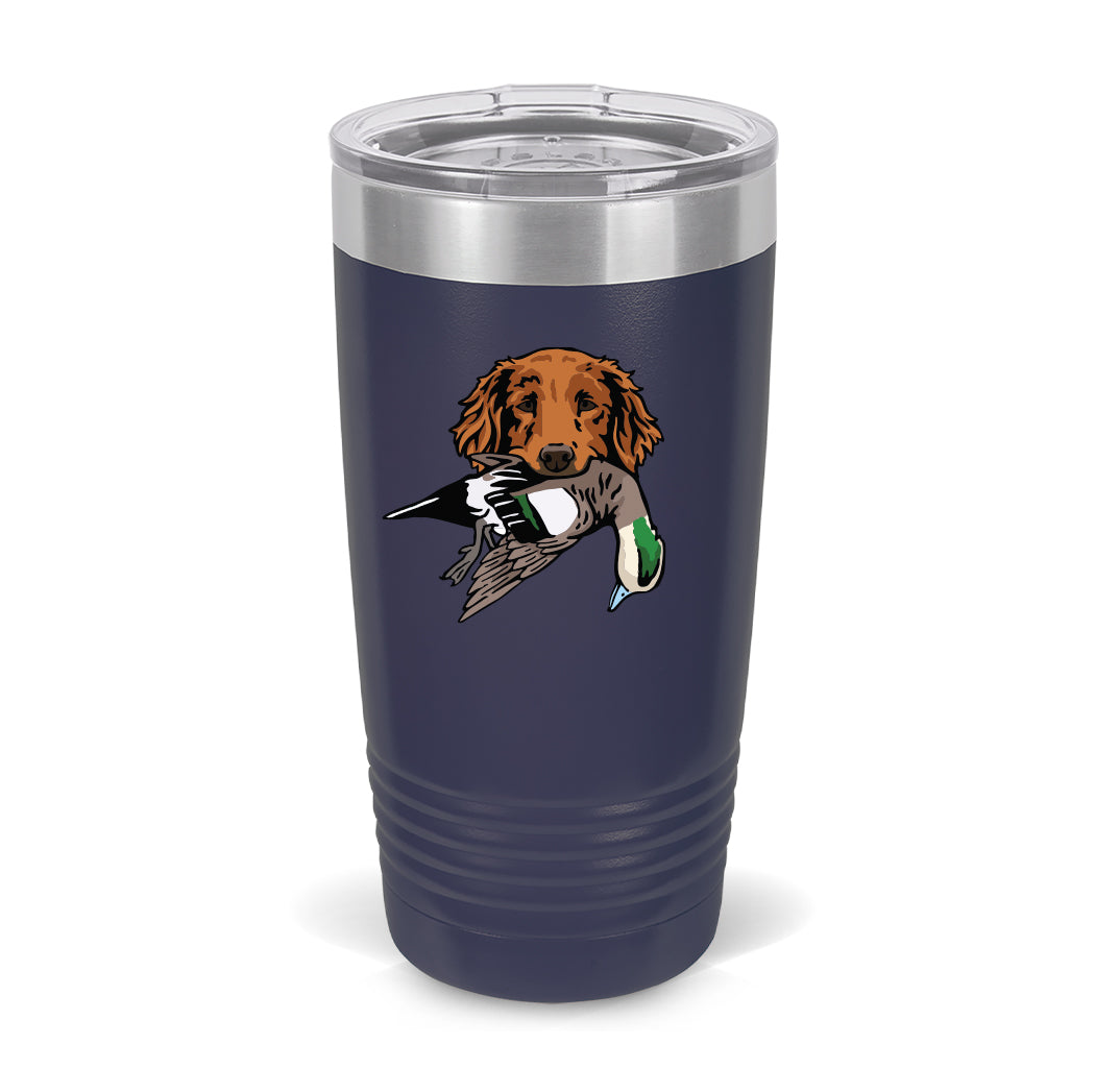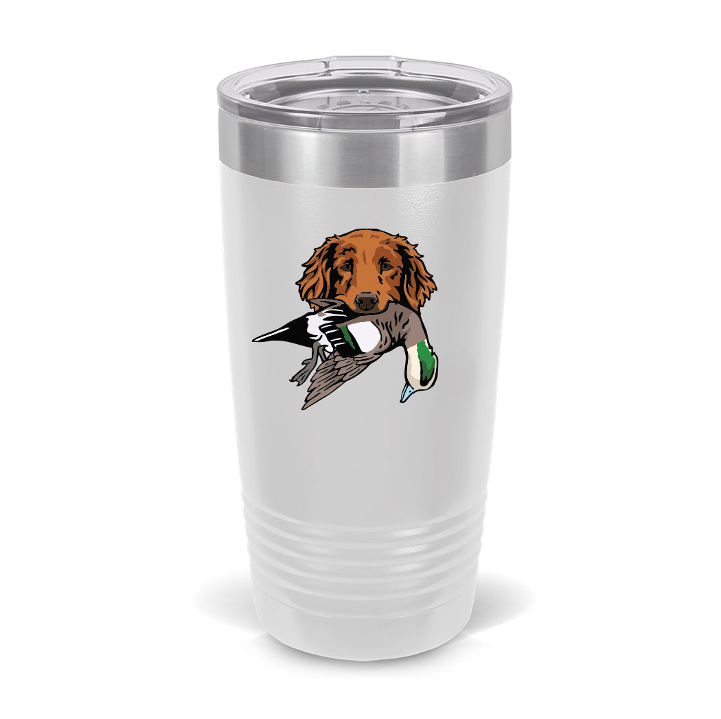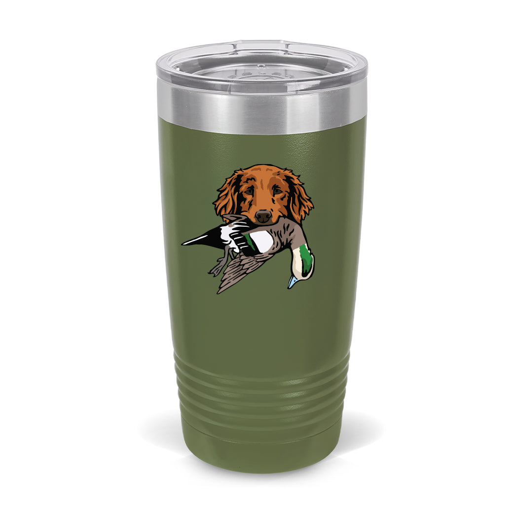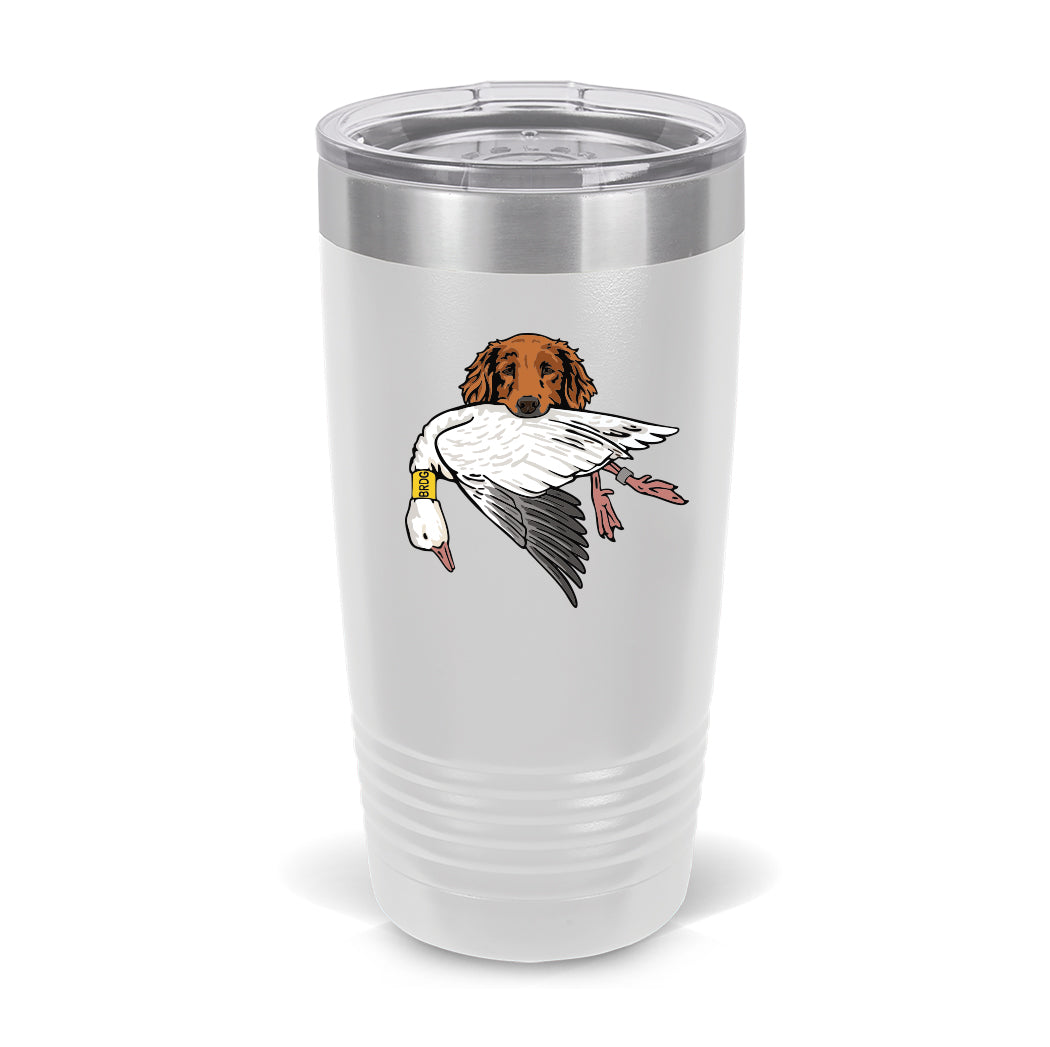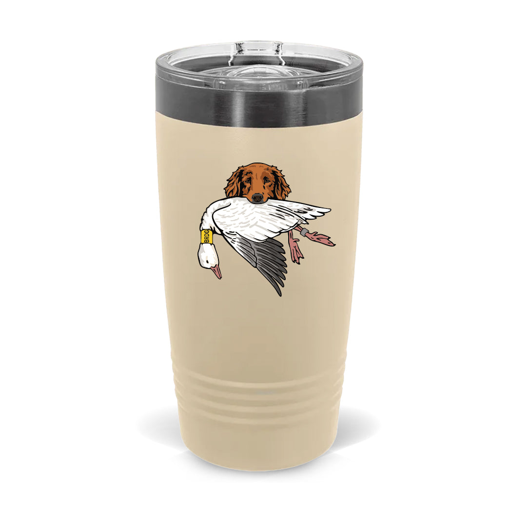 The Golden Retriever Bird Dog Pint Glass celebrates one of the most iconic and capable retrievers to ever hit the water. An American favorite with good looks and grit to match, the Golden Retriever in this design is proudly carrying a drake storm wigeon. Whether it's filled before first light in the field or proudly carried on the go, this tumbler honors the bird dogs and seasons that shape the stories we carry home.