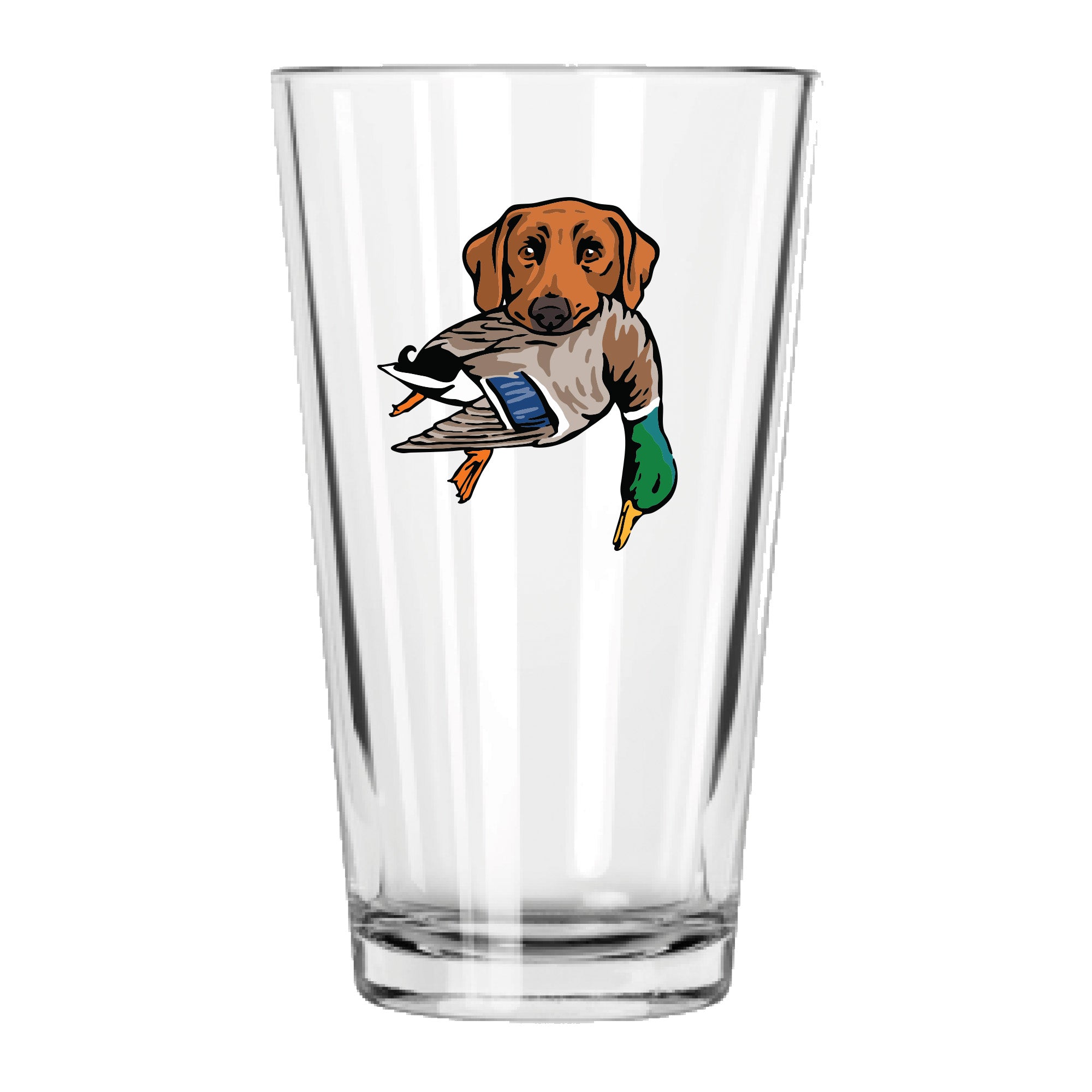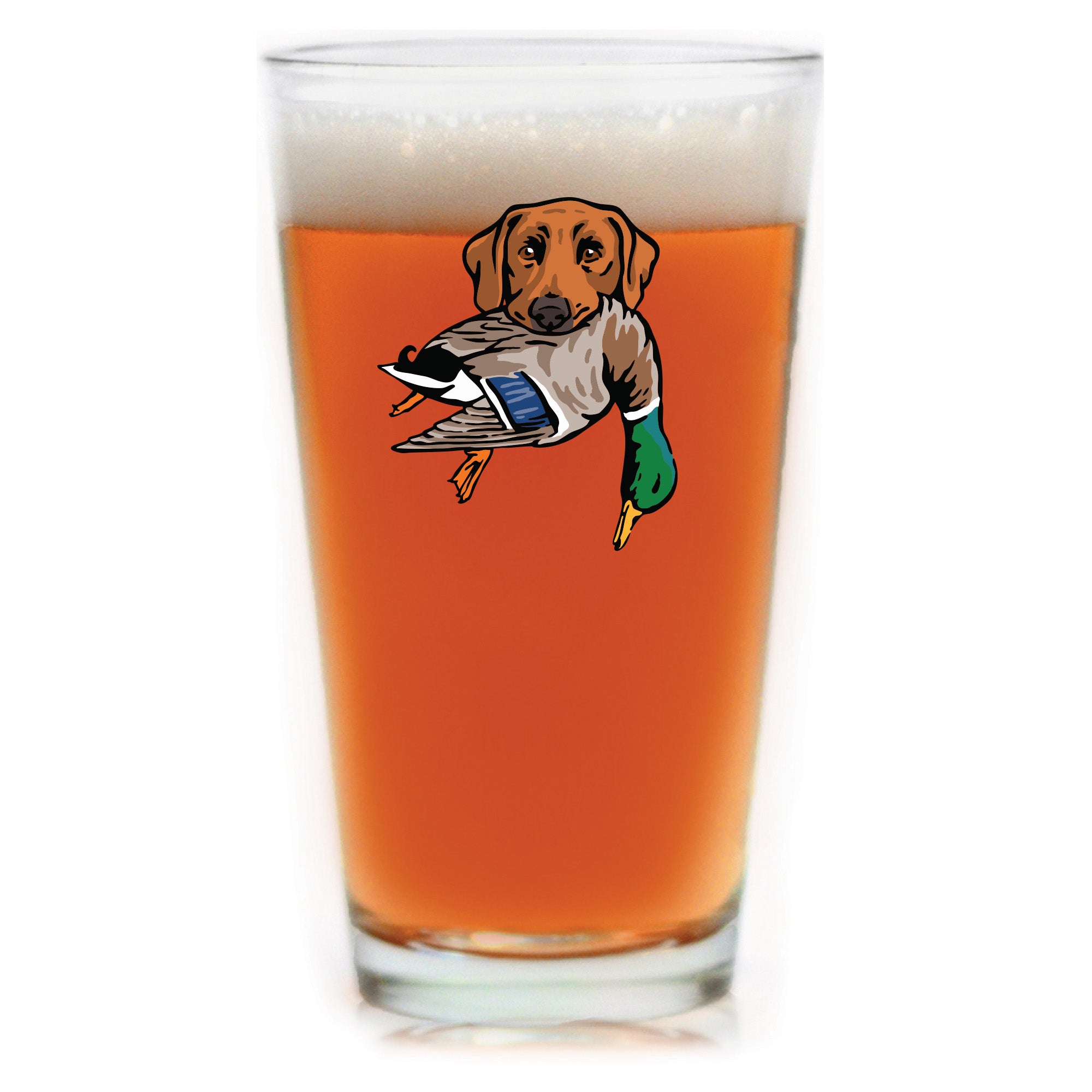 The Labrador Retriever Bird Dog Pint Glass celebrates this legendary duck dog, built for cold water, long retrieves and all-day hunts. The lab in this design is proudly carrying a mallard drake. Whether it's poured after a long day afield or shared with friend at camp, this glass honors the bird dogs and seasons that shape the stories we carry home.