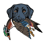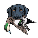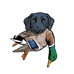 A classic Labrador Retriever retrieving a banded mallard drake, made for bird hunters and lab owners who live for bird seasons and time afield with a good dog.