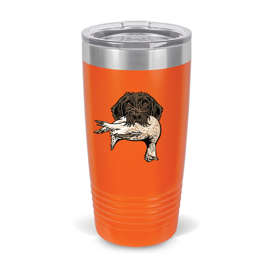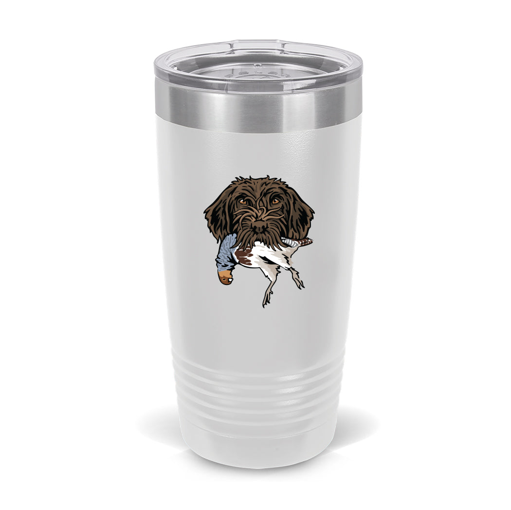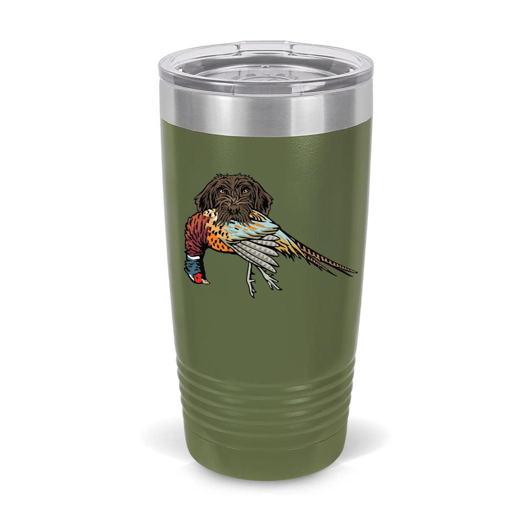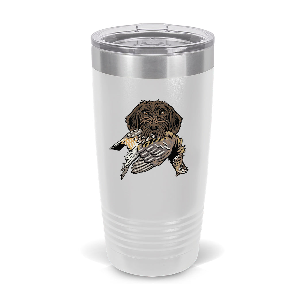 The Wirehaired Pointing Griffon Bird Dog Coffee Tumbler celebrates one of the most versatile bird dog breeds. Featuring a "Griff" proudly carrying a pheasant, this design honors the breed defined by cooperation, grit, a methodical nose, and that legendary beard.